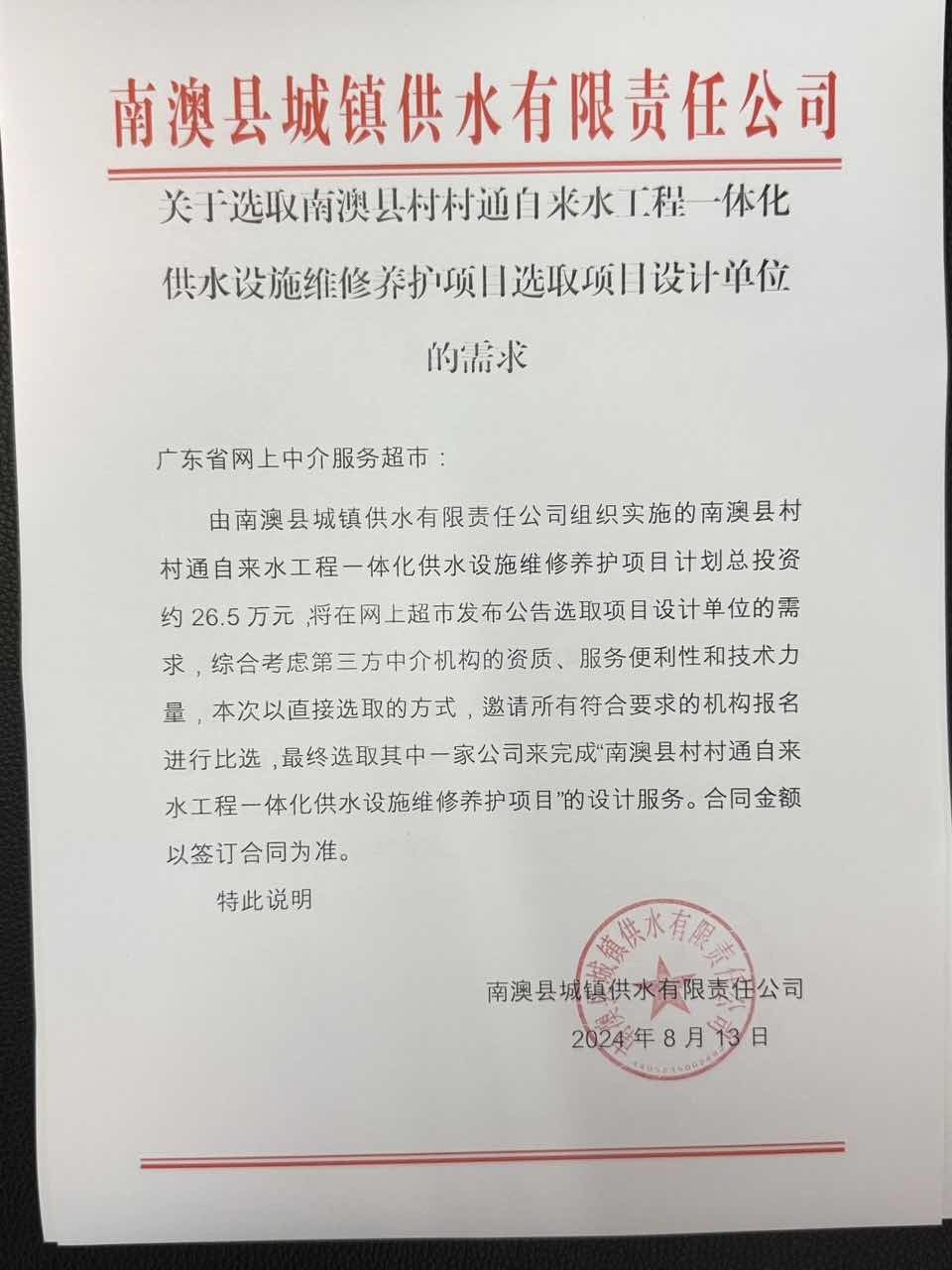 2025-08-19 17:30 ,在广东省网上中介服务超市为南澳县城镇供水有限责任公司 公开选取工程设计中介服务机构,现将相关事项公告如下: