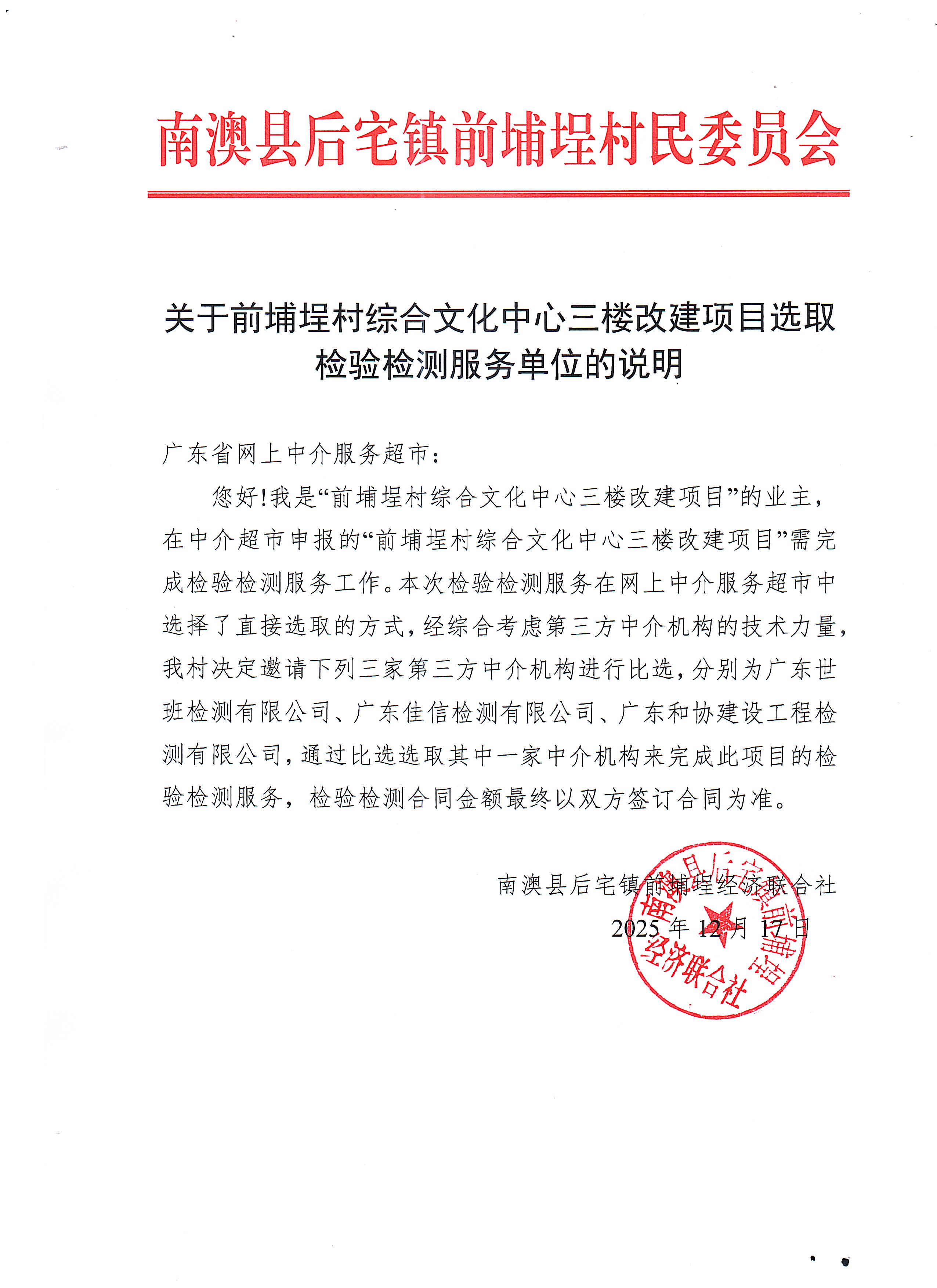 关于为【前埔埕村综合文化中心三楼改建项目】公开选取【检验检测服务】机构的公告