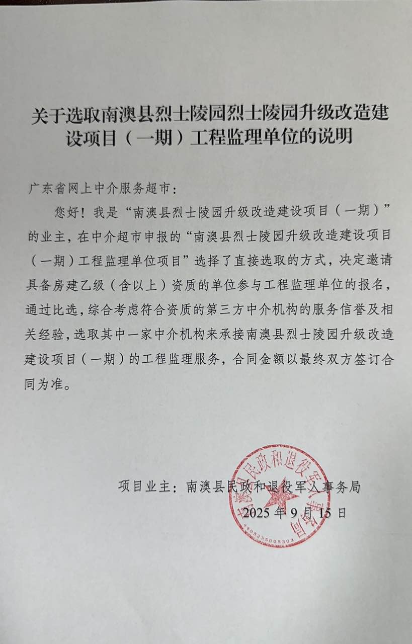2025-09-19 17:30 ,在广东省网上中介服务超市为南澳县民政和退役军人事务局 公开选取工程监理中介服务机构,现将相关事项公告如下: