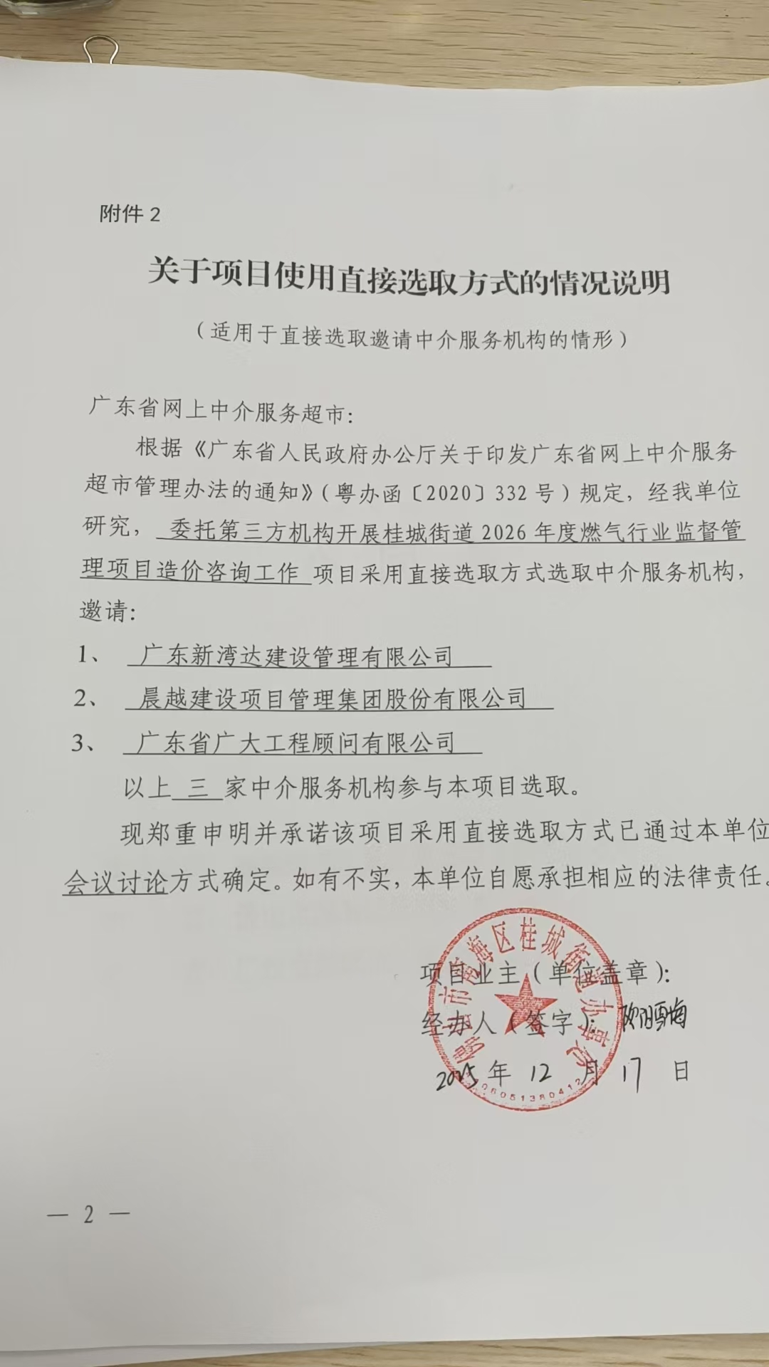 鉴于桂城街道2026年度燃气行业监督管理项目由我办开展实施,现为项目的正常开展,我办拟开展该项目的预算编制工作,并通过在广东“中介超市”中选取有丰富相关经验的单位负责该工作,特此说明。