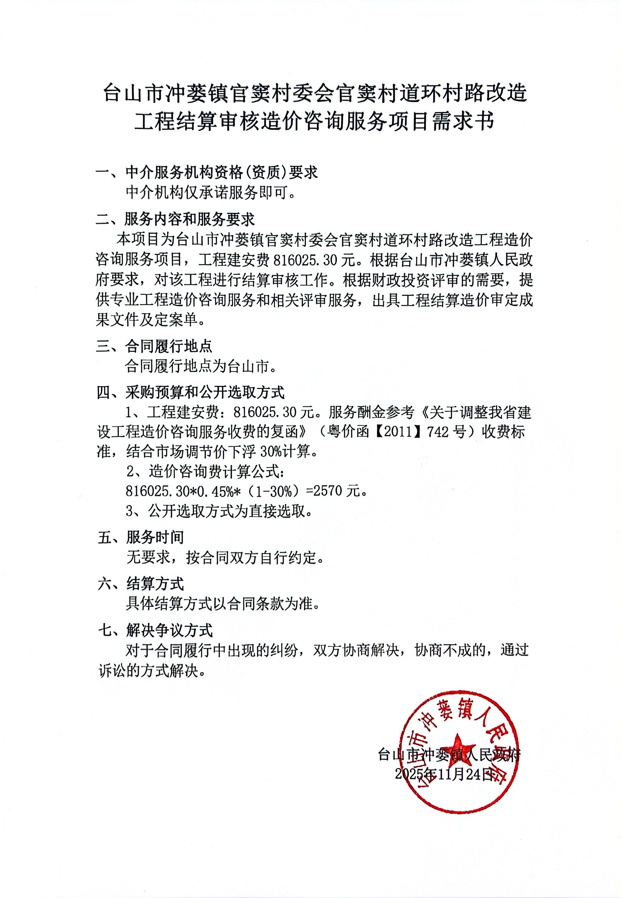 关于为【台山市冲蒌镇官窦村委会官窦村道环村路改造工程结算审核造价咨询服务项目】公开选取【工程造价咨询】机构的公告