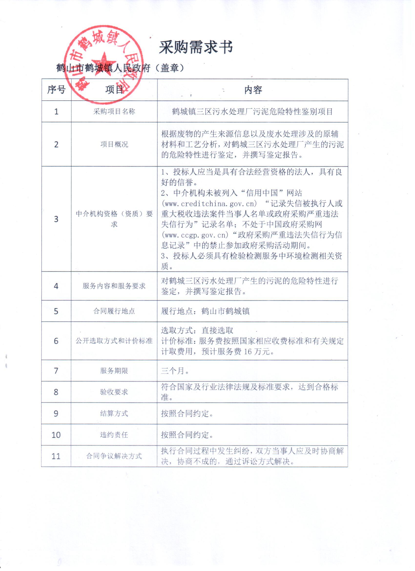 关于为【鹤城镇三区污水处理厂污泥危险特性鉴别项目】公开选取【检验检测服务】机构的公告