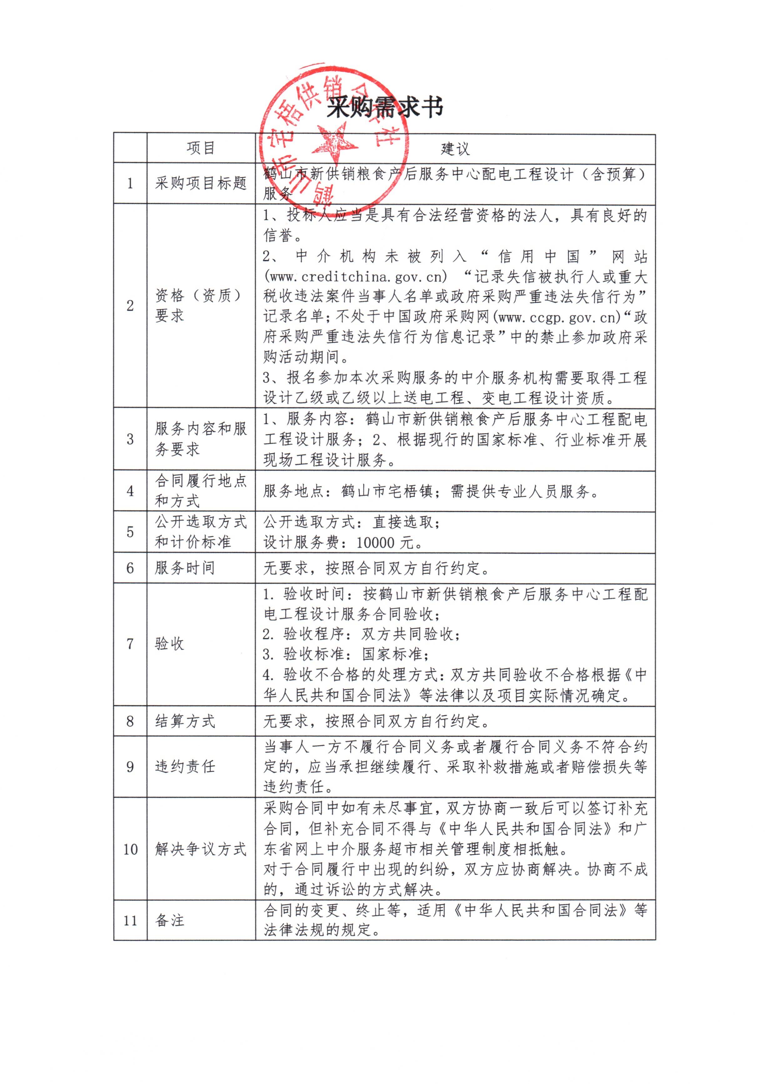关于为【鹤山市新供销粮食产后服务中心配电工程设计(含预算)服务】公开选取【工程设计】机构的公告