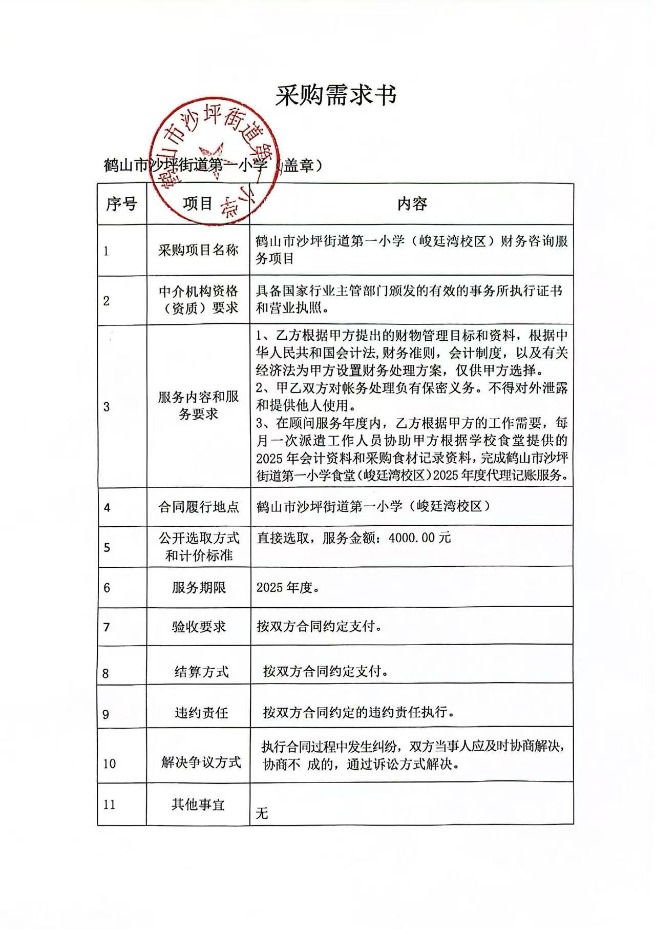 鹤山市沙坪街道第一小学食堂(峻廷湾校区)2025年度财务咨询服务