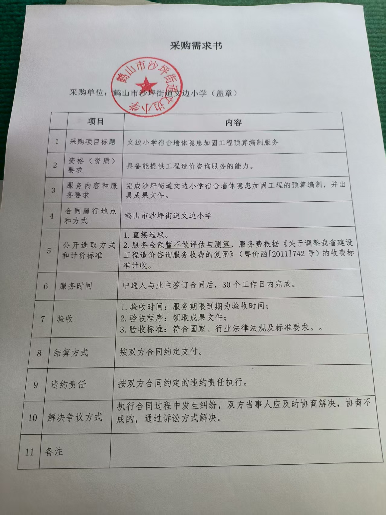 关于为【文边小学宿舍墙体隐患加固工程预算编制服务】公开选取【工程造价咨询】机构的公告
