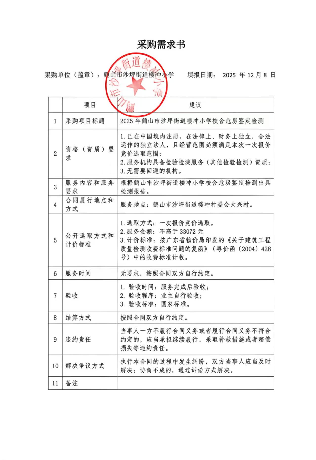 关于为【2025年鹤山市沙坪街道楼冲小学校舍危房鉴定检测】公开选取【检验检测服务】机构的公告