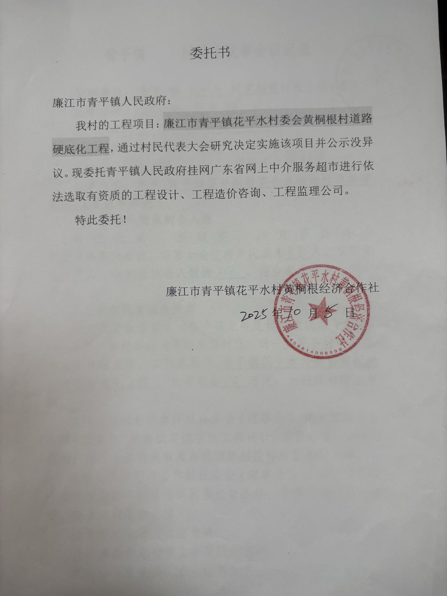 廉江市青平镇花平水村委会黄桐根村道路硬底化工程监理