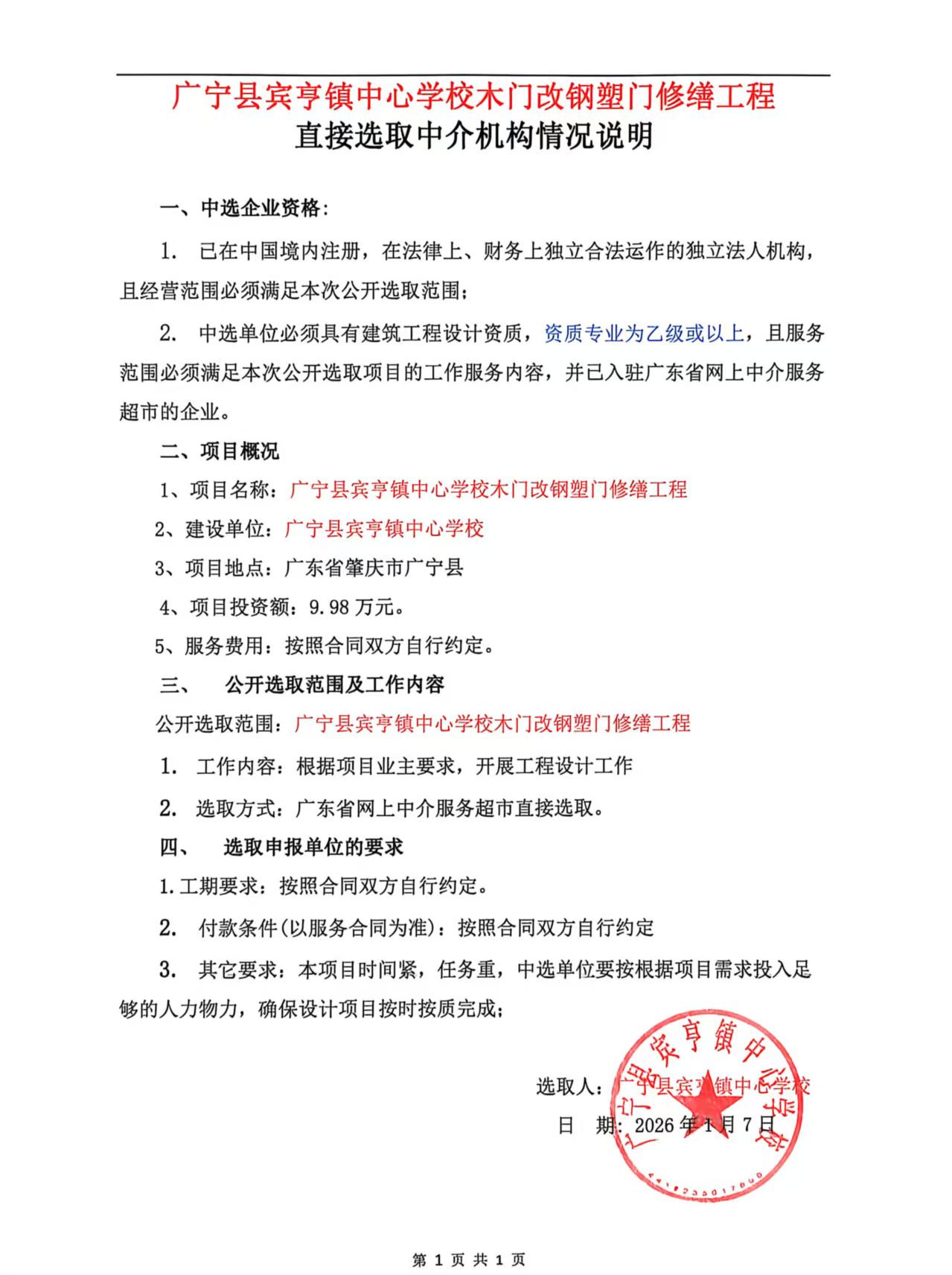 2026-01-09 17:30 ,在广东省网上中介服务超市为广宁县宾亨镇中心学校 公开选取工程设计中介服务机构,现将相关事项公告如下:
