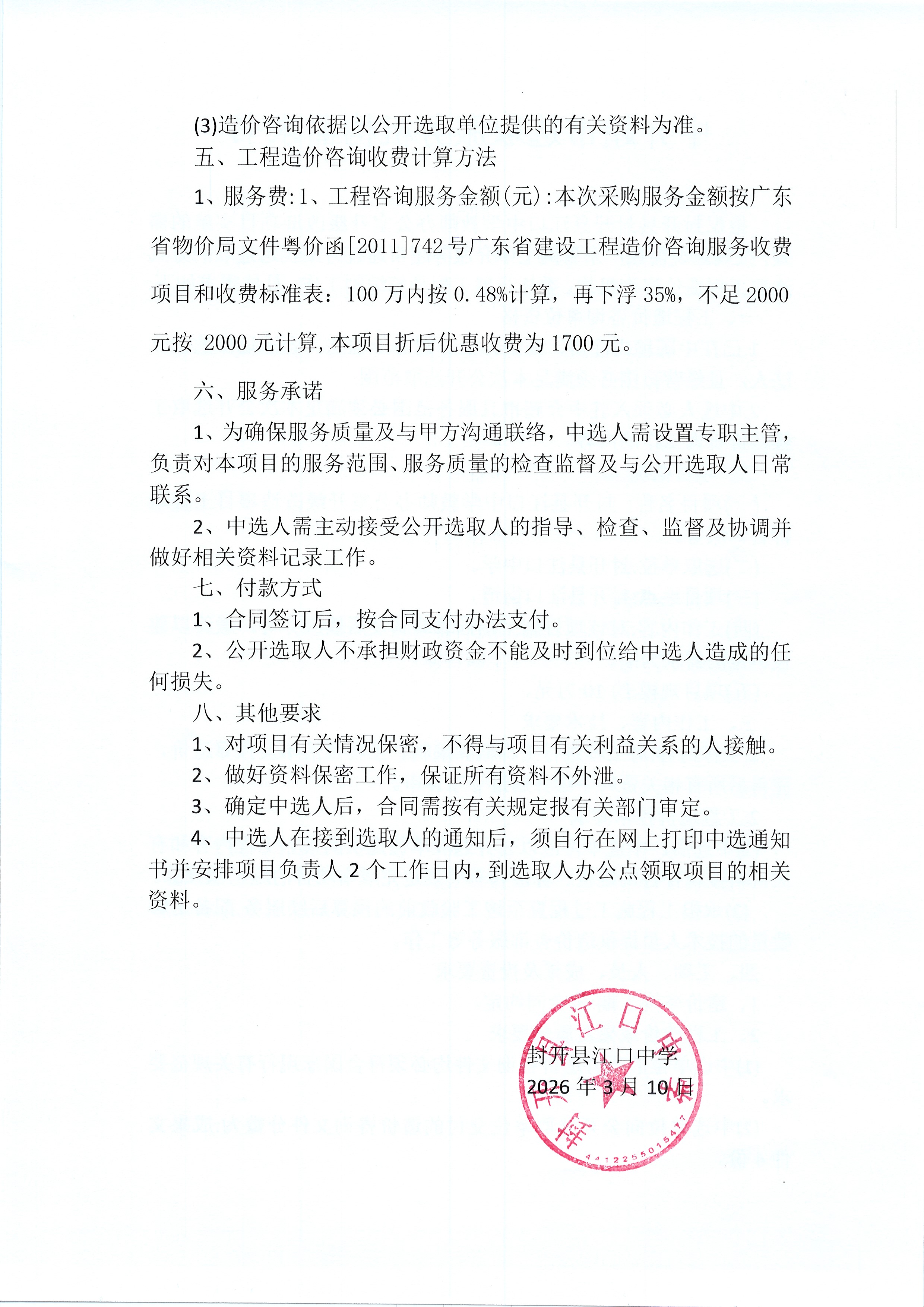 本次采购服务金额按广东省物价局文件粤价函[2011]742号广东省建设工程造价咨询服务收费项目和收费标准表:100万内按0.48%计算,再下浮35%,不足2000元按 2000元计算,本项目折后优惠收费为1700元。