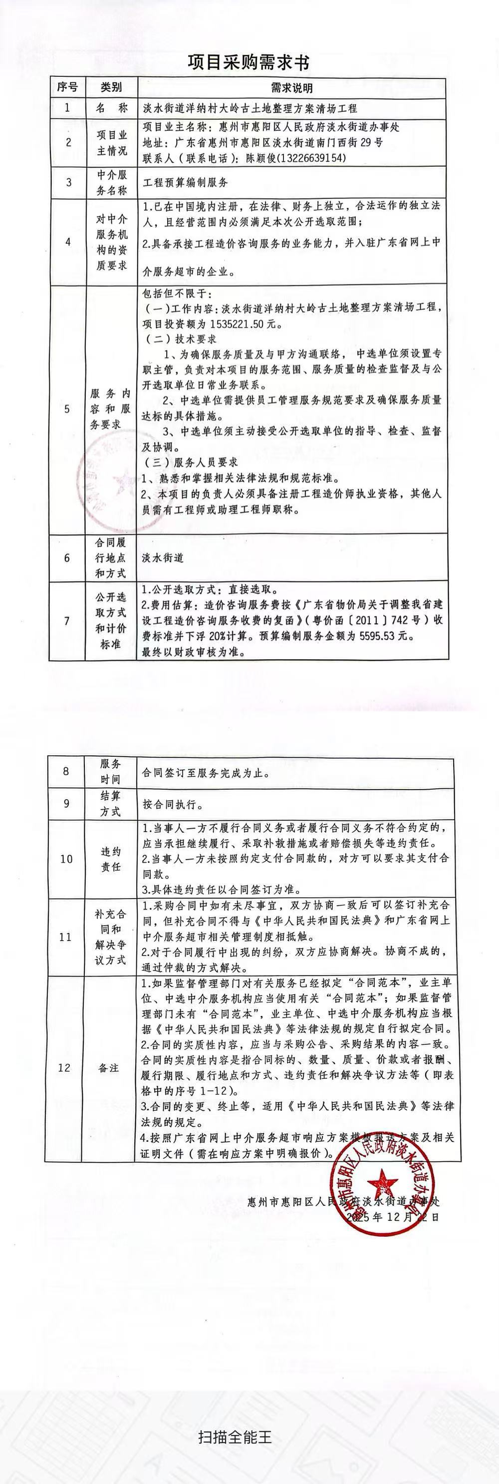 关于为【淡水街道洋纳村大岭古土地整理方案清场工程造价咨询服务费服务】公开选取【工程造价咨询】机构的公告