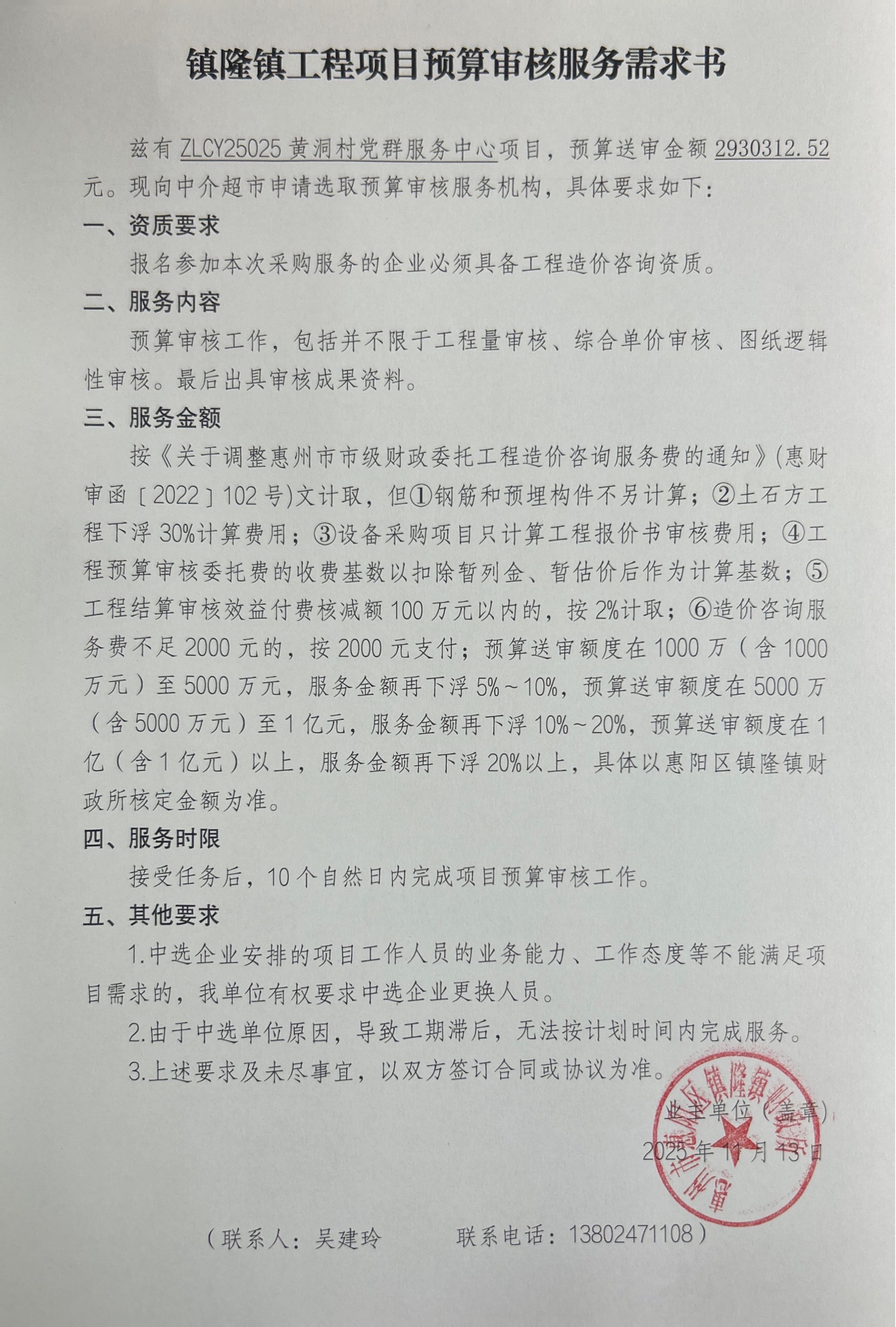 ZLCY25025黄洞村党群服务中心采购预算审核服务