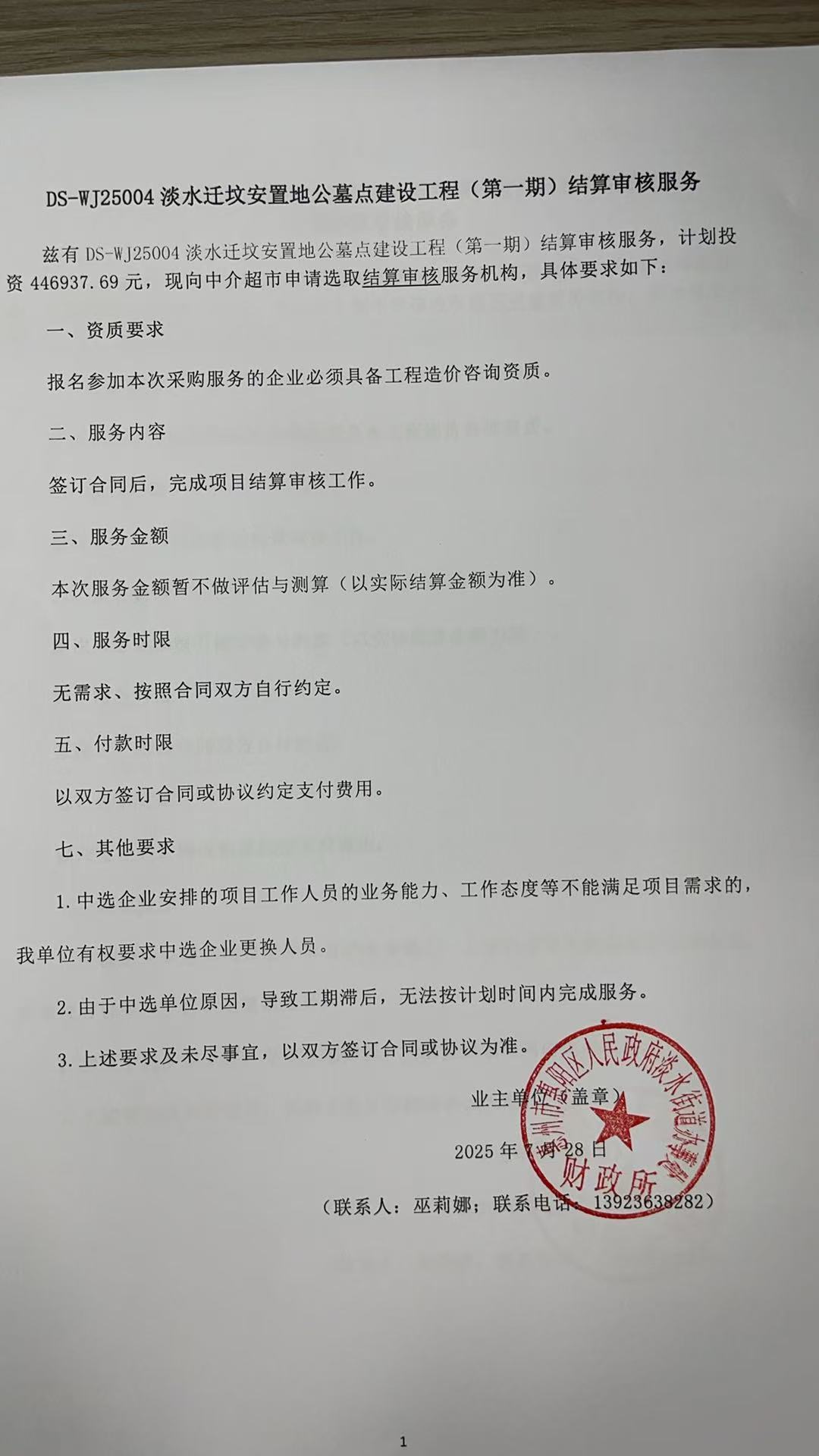 关于为【DS-WJ25004淡水迁坟安置地公墓点建设工程(第一期)结算审核】公开选取【工程造价咨询】机构的公告
