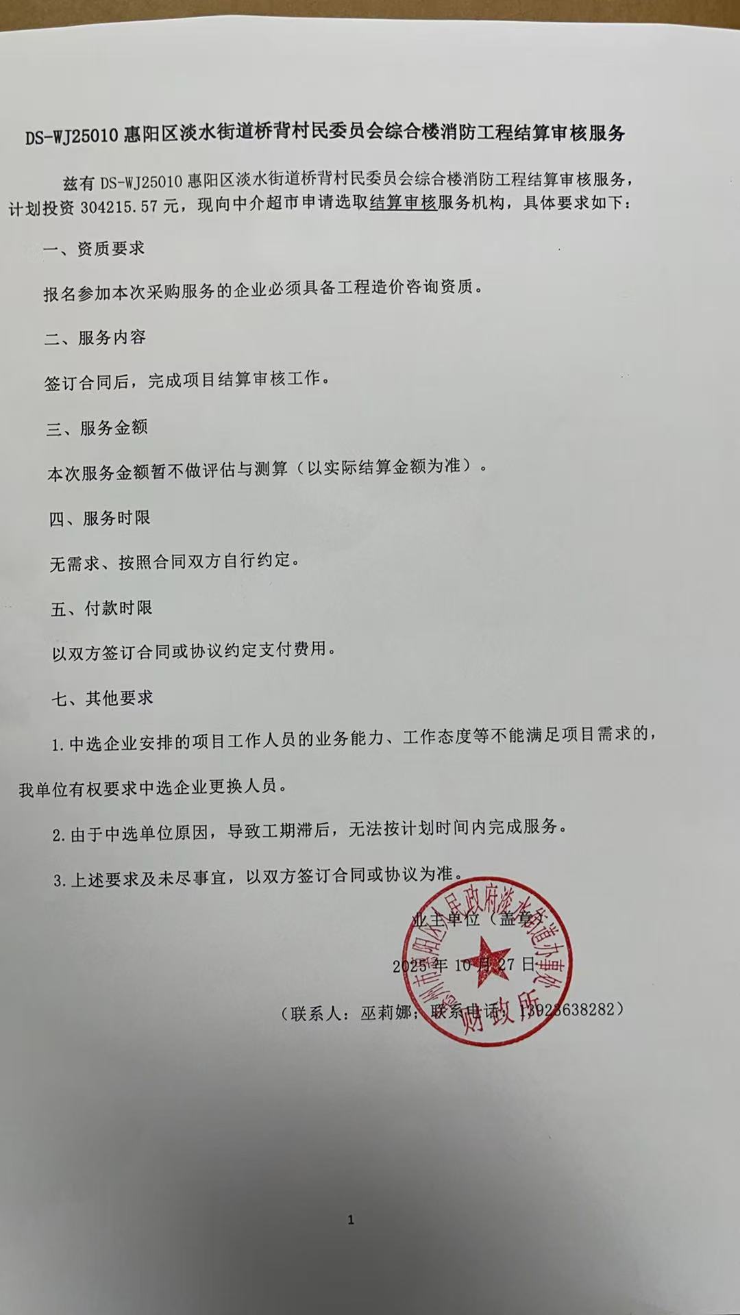 关于为【DS-WJ25010惠阳区淡水街道桥背村民委员会综合楼消防工程结算审核】公开选取【工程造价咨询】机构的公告