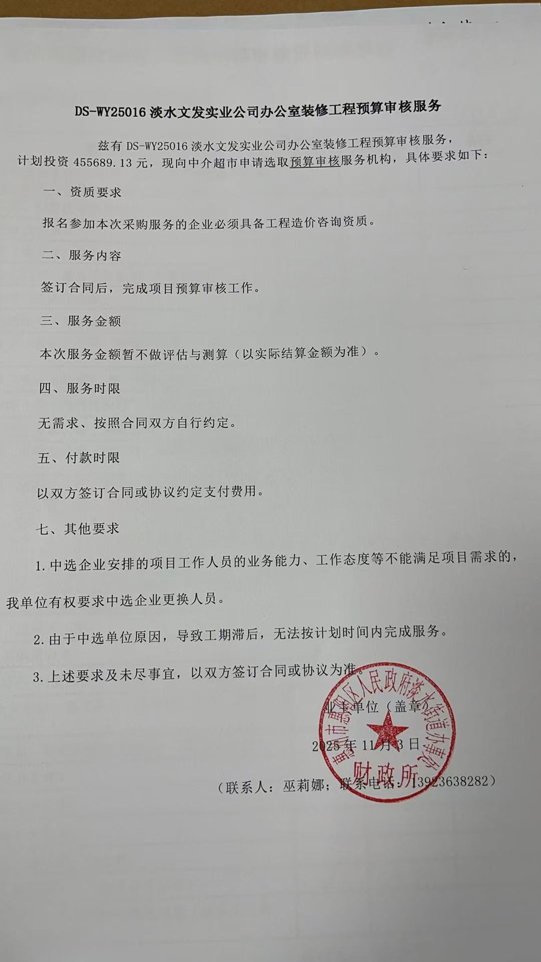 关于为【DS-WY25016淡水文发实业公司办公室装修工程预算审核】公开选取【工程造价咨询】机构的公告