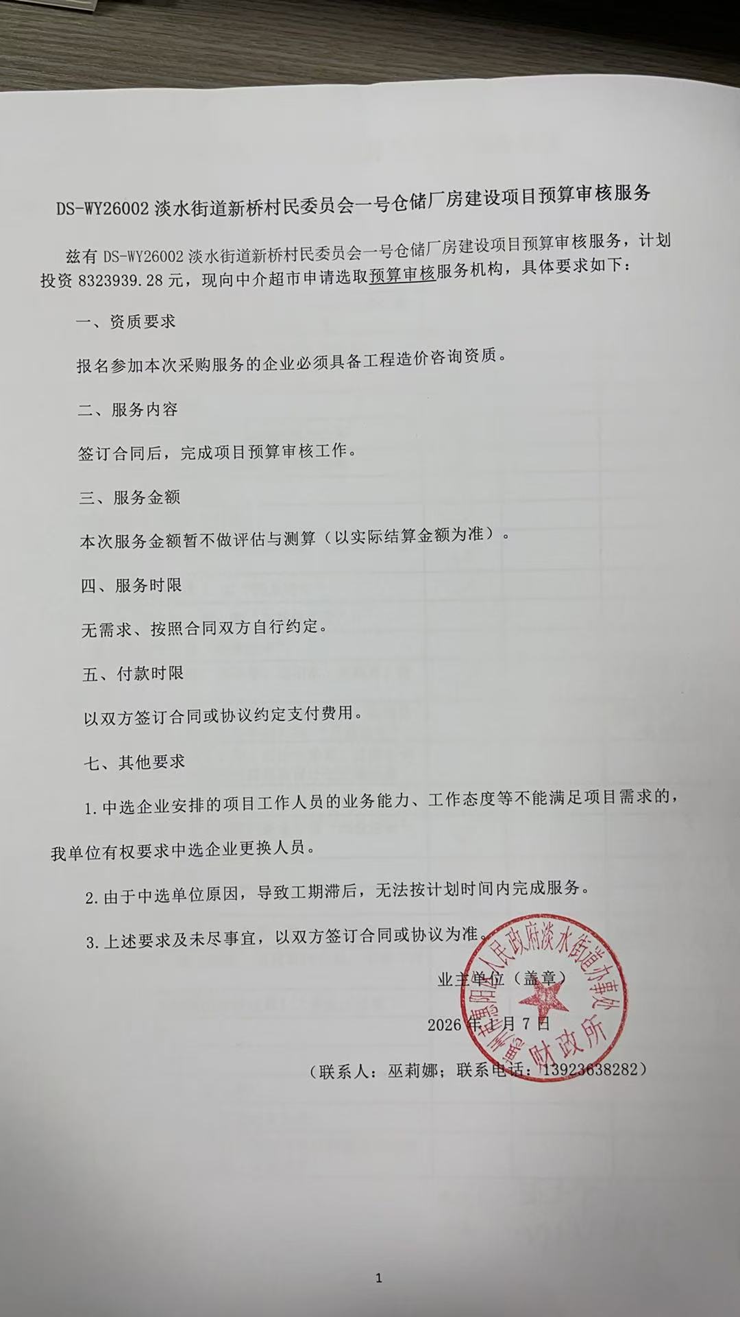 DS-WY26002淡水街道新桥村民委员会一号仓储厂房建设项目预算审核服务