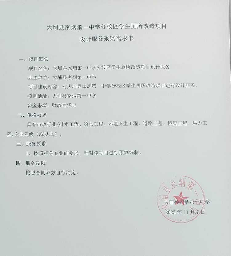 2025-11-11 17:30 ,在广东省网上中介服务超市为大埔县家炳第一中学 公开选取工程设计中介服务机构,现将相关事项公告如下: