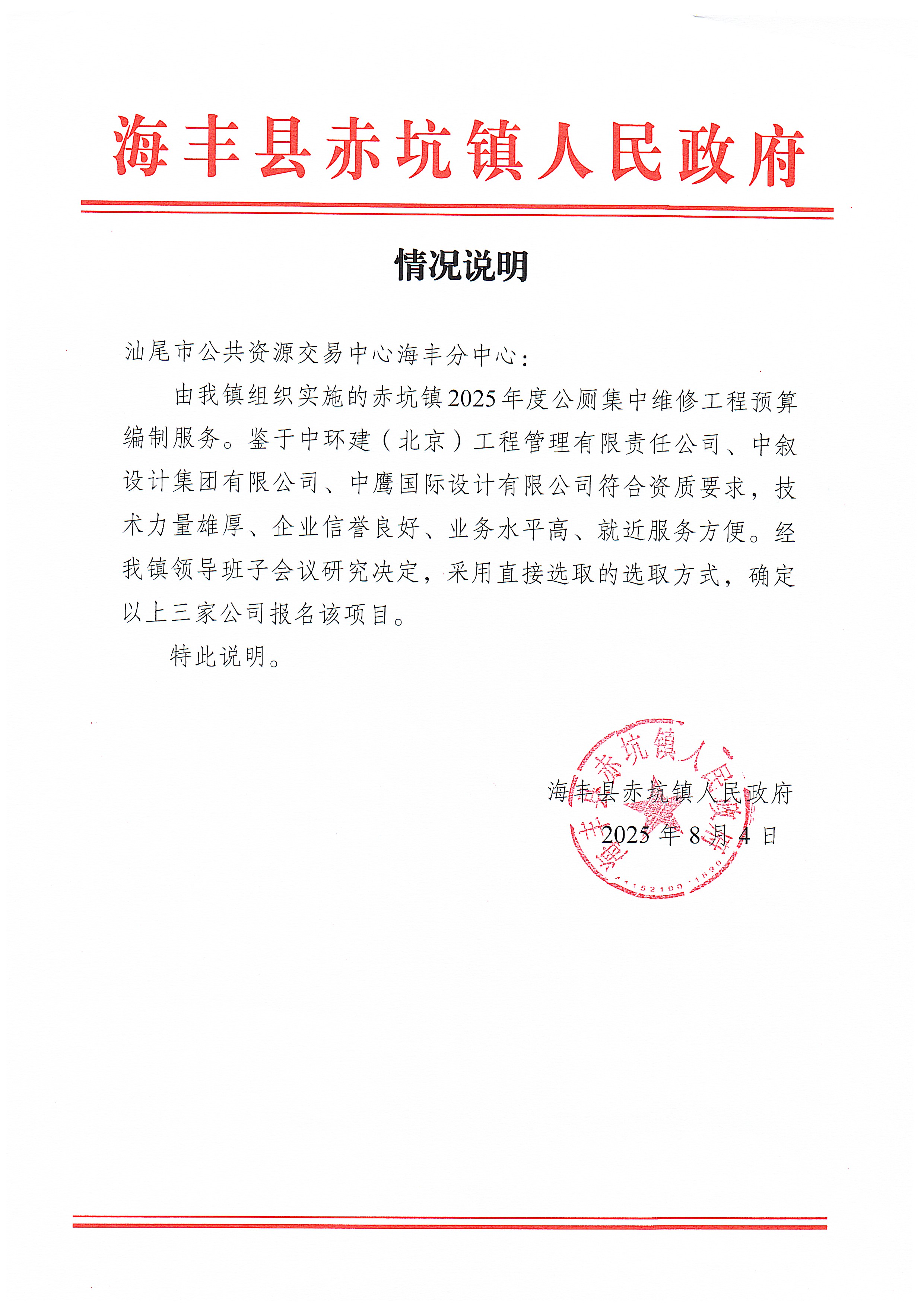 关于为【赤坑镇2025年度公厕集中维修工程预算编制服务】公开选取【工程造价咨询】机构的公告