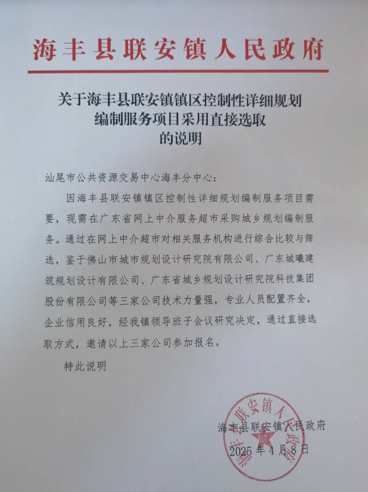 关于为【海丰县联安镇镇区控制性详细规划编制服务项目】公开选取【城乡规划编制】机构的公告