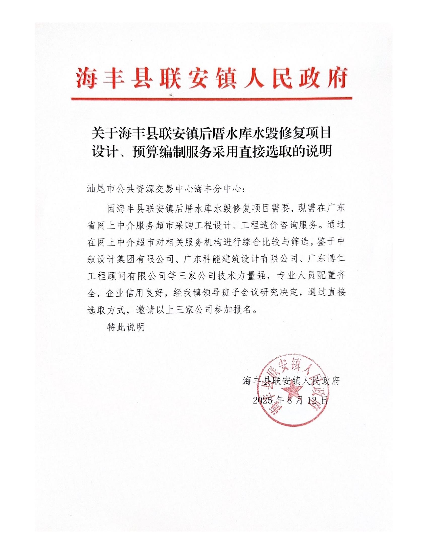 关于为【海丰县联安镇后厝水库水毁修复项目设计、预算编制服务】公开选取【工程设计,工程造价咨询】机构的公告