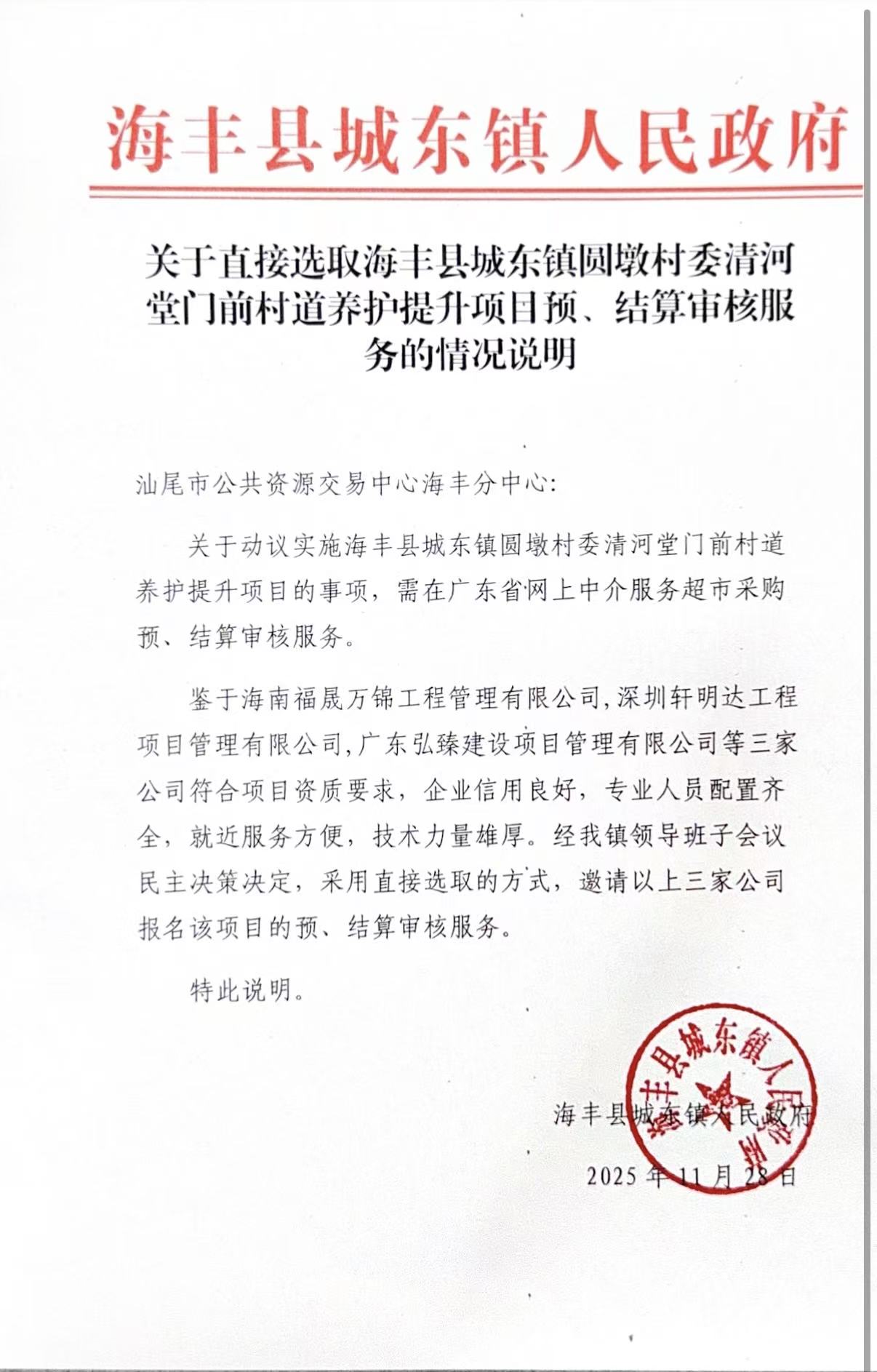 鉴于海南福晟万锦工程管理有限公司,深圳轩明达工程项目管理有限公司,广东弘臻建设项目管理有限公司等三家公司符合项目资质要求,企业信用良好,专业人员配置齐全,就近服务方便,技术力量雄厚。经我镇领导班子会议民主决策决定,采用直接选取的方式,邀请以上三家公司报名该项目的预、结算审核服务。