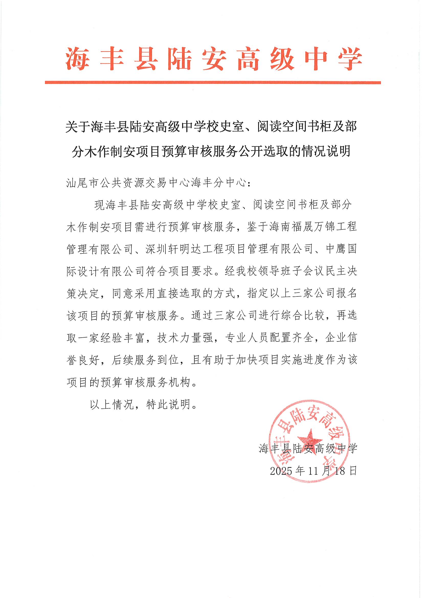 现海丰县陆安高级中学校史室、阅读空间书柜及部分木作制安项目需进行预算审核服务,鉴于海南福晟万锦工程管理有限公司、深圳轩明达工程项目管理有限公司、中鹰国际设计有限公司符合项目要求。经我校领导班子会议民主决策决定,同意采用直接选取的方式,指定以上三家公司报名该项目的预算审核服务。通过三家公司进行综合比较,再选取一家经验丰富,技术力量强,专业人员配置齐全,企业信誉良好,后续服务到位,且有助于加快项目实施进度作为该项目的预算审核服务机构。