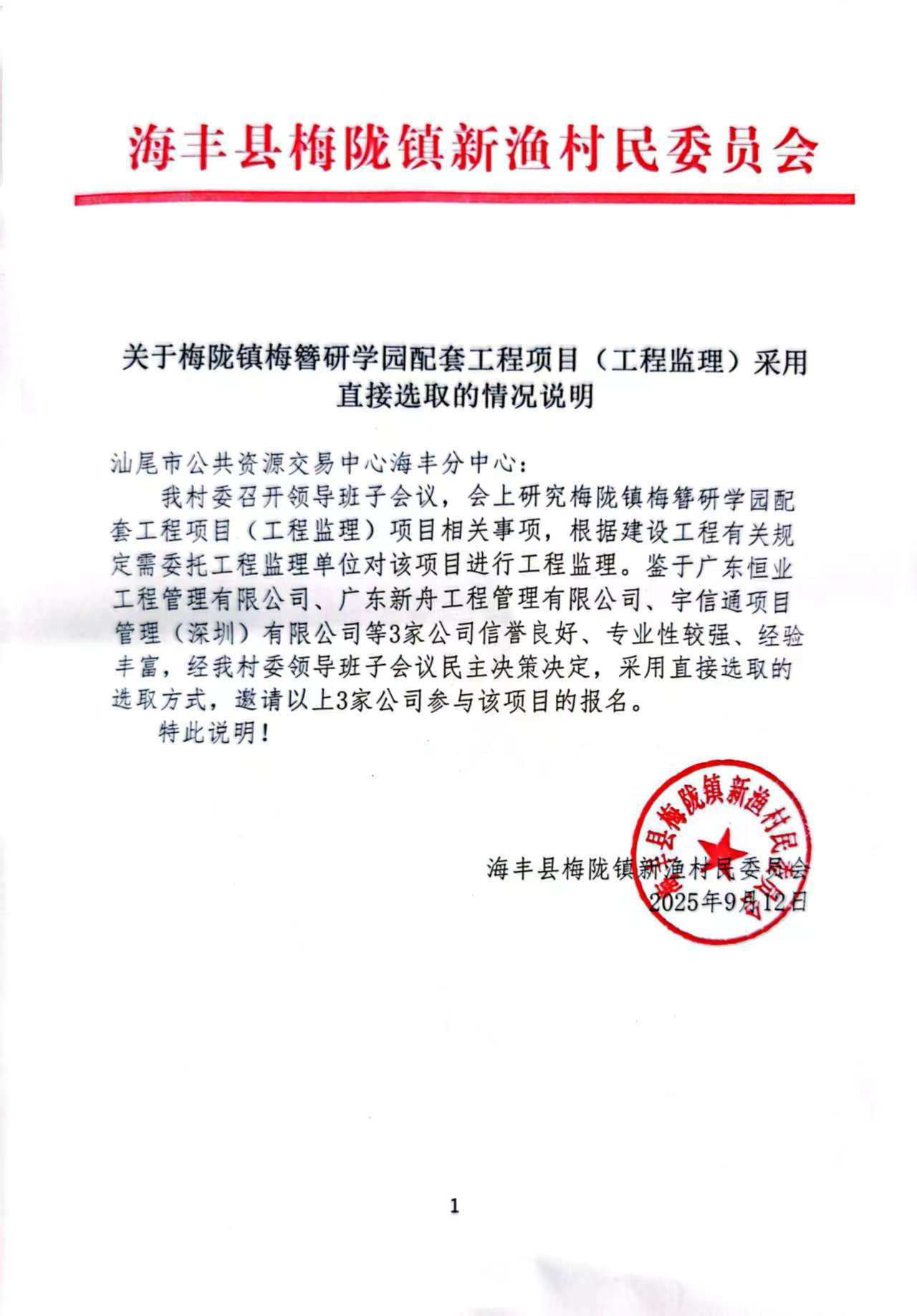 鉴于广东恒业工程管理有限公司、广东新舟工程管理有限公司、宇信通项目管理(深圳)有限公司等3家公司信誉良好、专业性较强、经验丰富,经我村委领导班子会议民主决策决定,采用直接选取的选取方式,邀请以上3家公司参与该项目的报名。