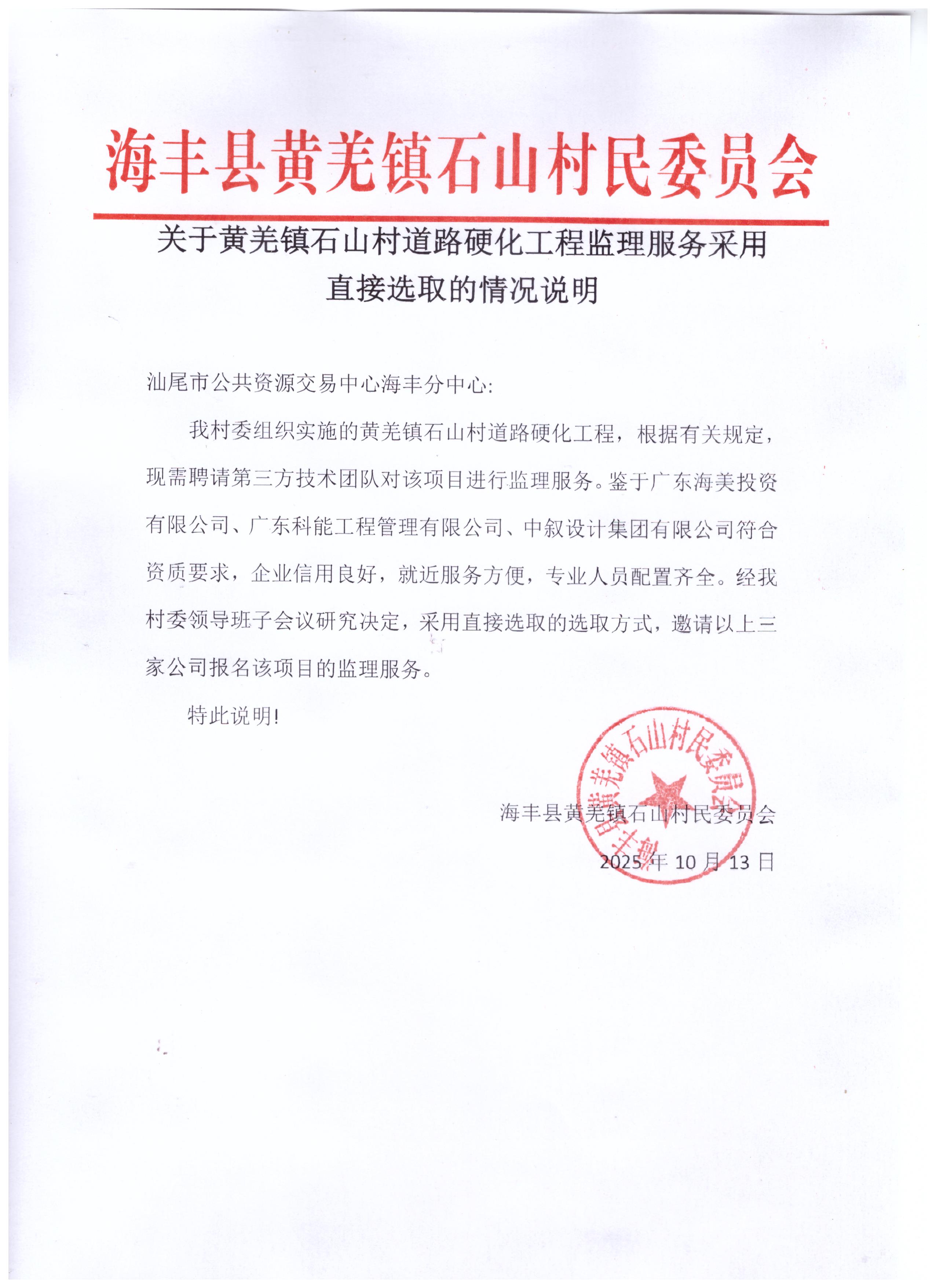 我村委组织实施的黄羌镇石山村道路硬化工程,根据有关规定,现需聘请第三方技术团队对该项目进行监理服务。鉴于广东海美投资有限公司、广东科能工程管理有限公司、中叙设计集团有限公司符合资质要求,企业信用良好,就近服务方便,专业人员配置齐全。经我村委领导班子会议研究决定,采用直接选取的选取方式,邀请以上三家公司报名该项目的监理服务。