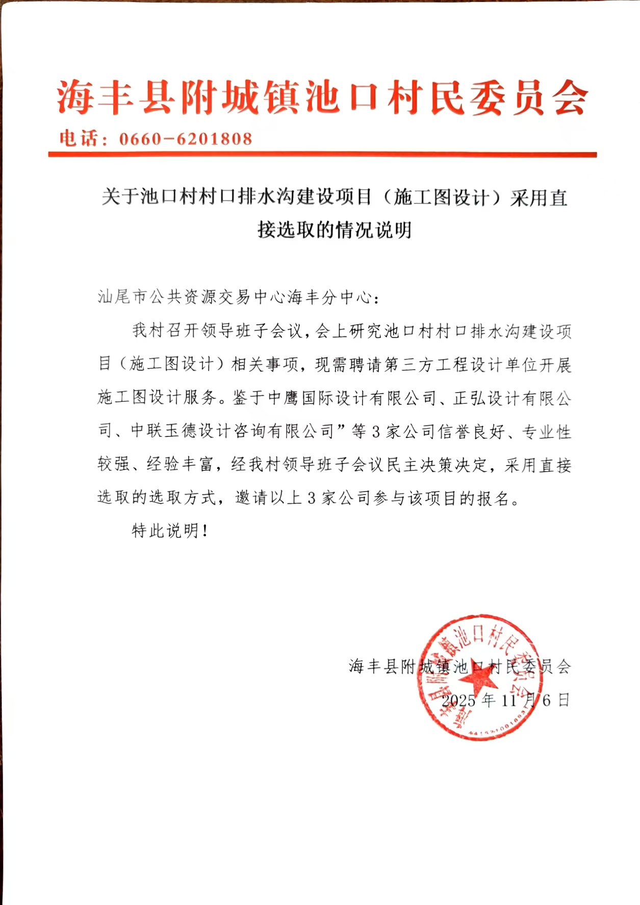 关于为【池口村村口排水沟建设项目(施工图设计)】公开选取【工程设计】机构的公告
