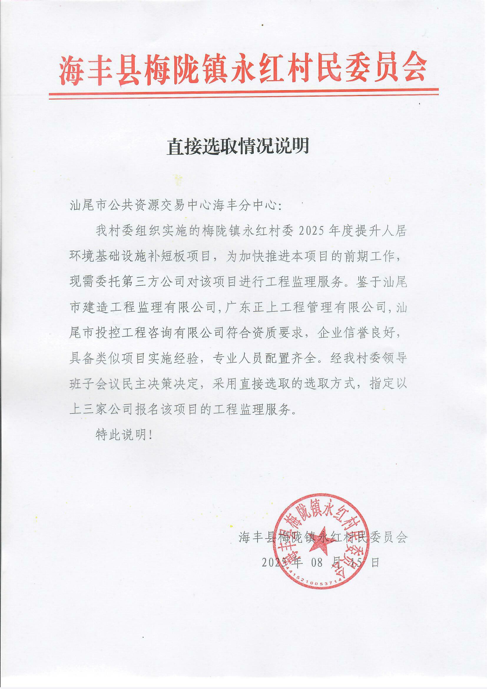 关于为【梅陇镇永红村委2025年度提升人居环境基础设施补短板项目监理服务】公开选取【工程监理】机构的公告