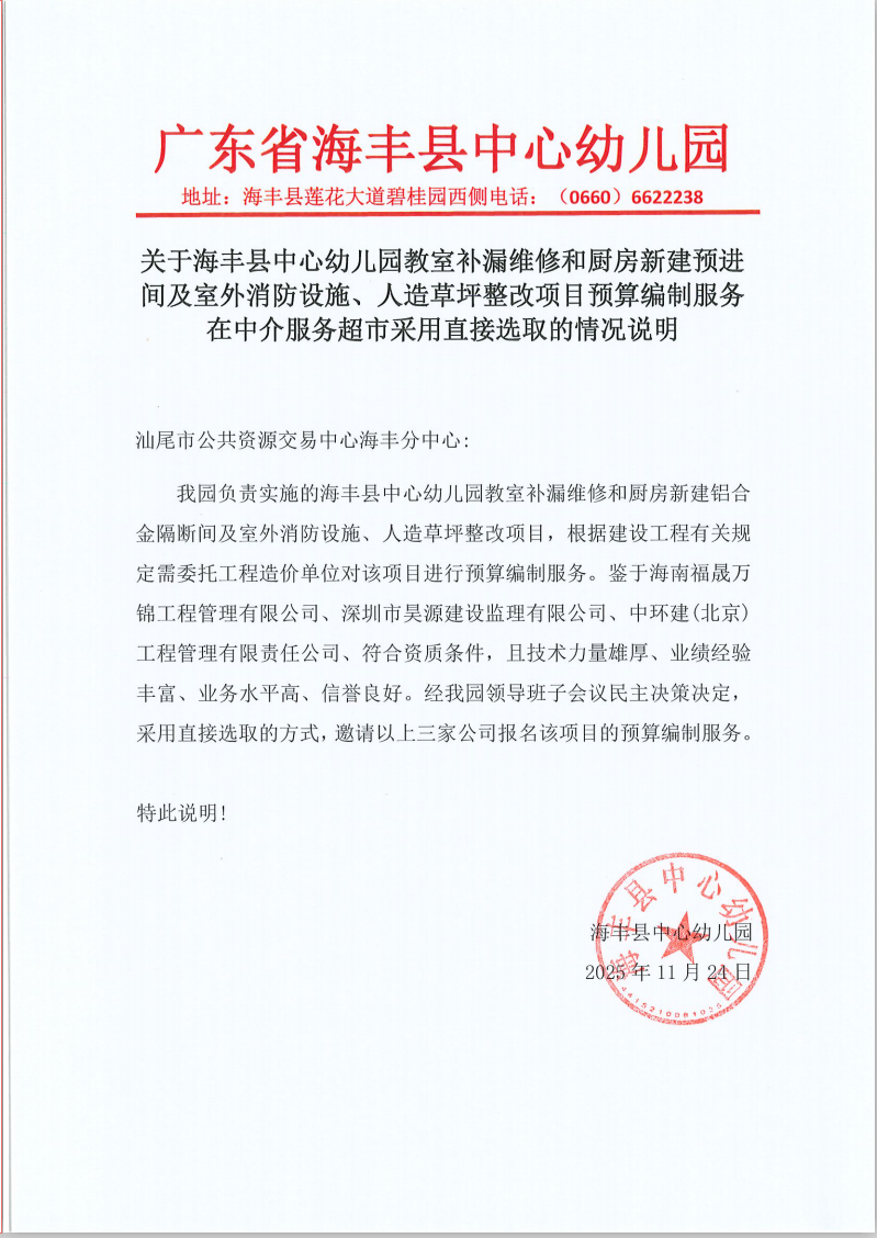 关于为【海丰县中心幼儿园教室补漏维修和厨房新建预进间及室外消防设施、人造草坪整改项目预算编制服务】公开选取【工程造价咨询】机构的公告