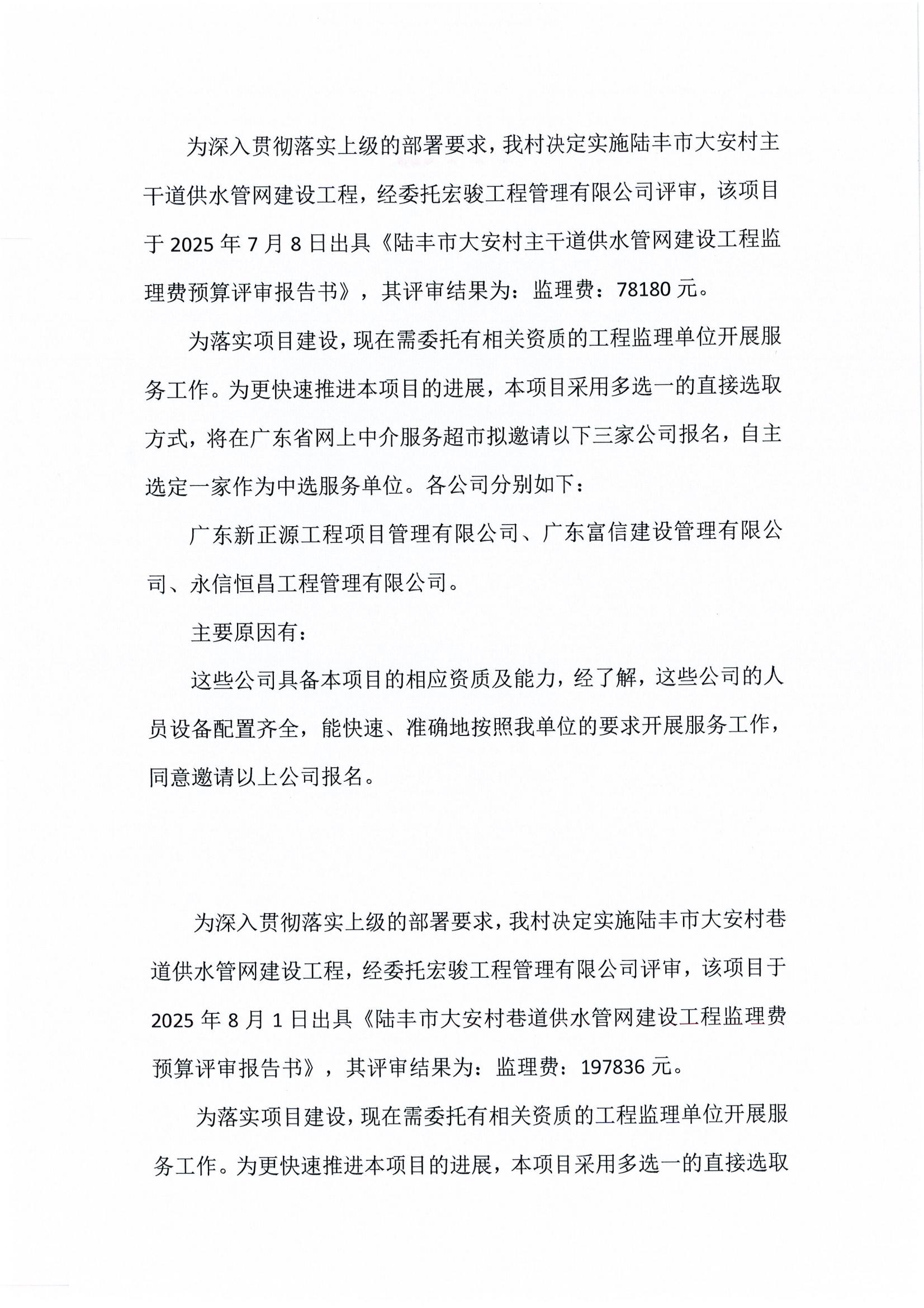 关于为【陆丰市大安村主干道供水管网建设工程】公开选取【工程监理】机构的公告