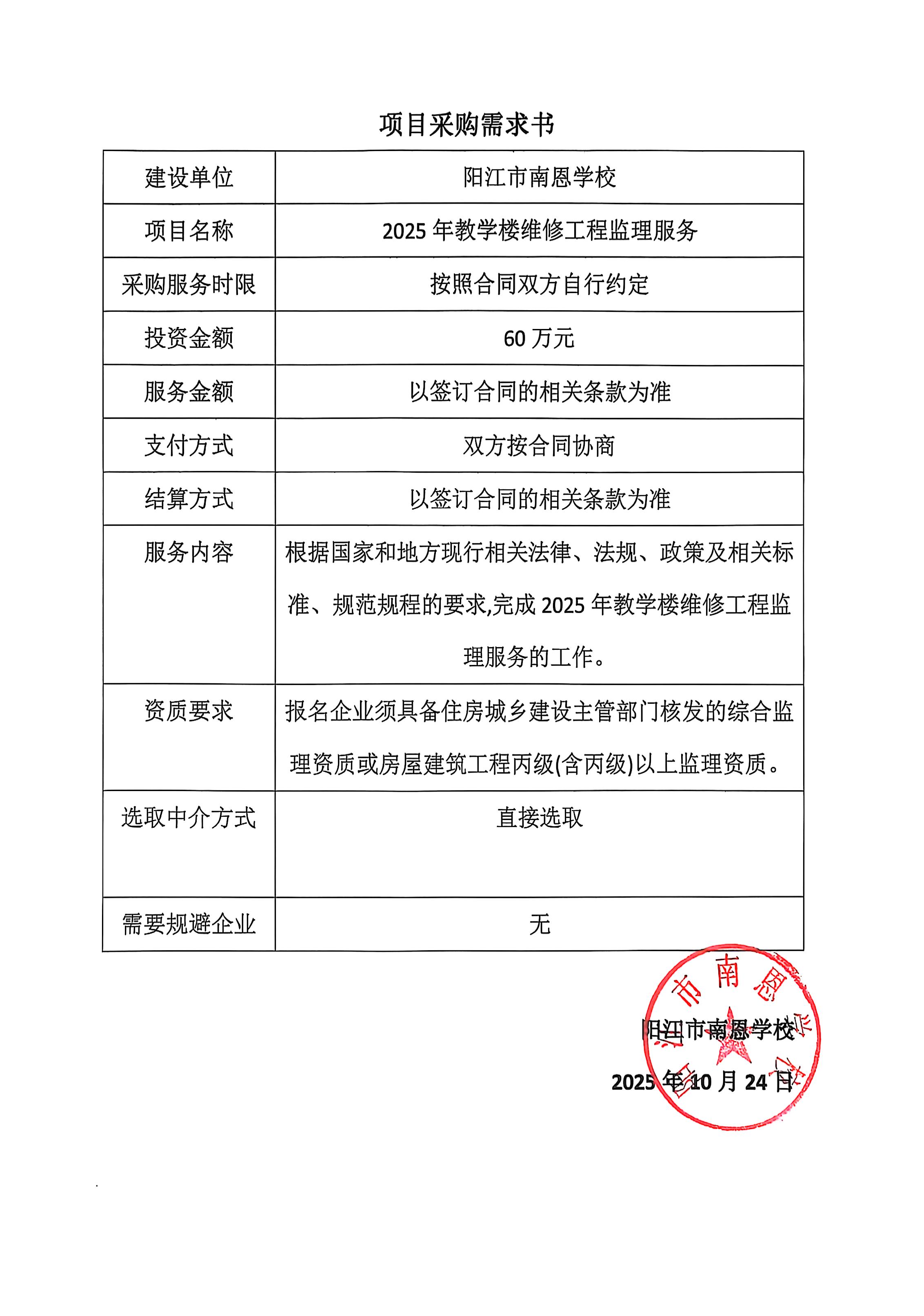 2025-10-28 17:30 ,在广东省网上中介服务超市为阳江市南恩学校 公开选取工程监理中介服务机构,现将相关事项公告如下: