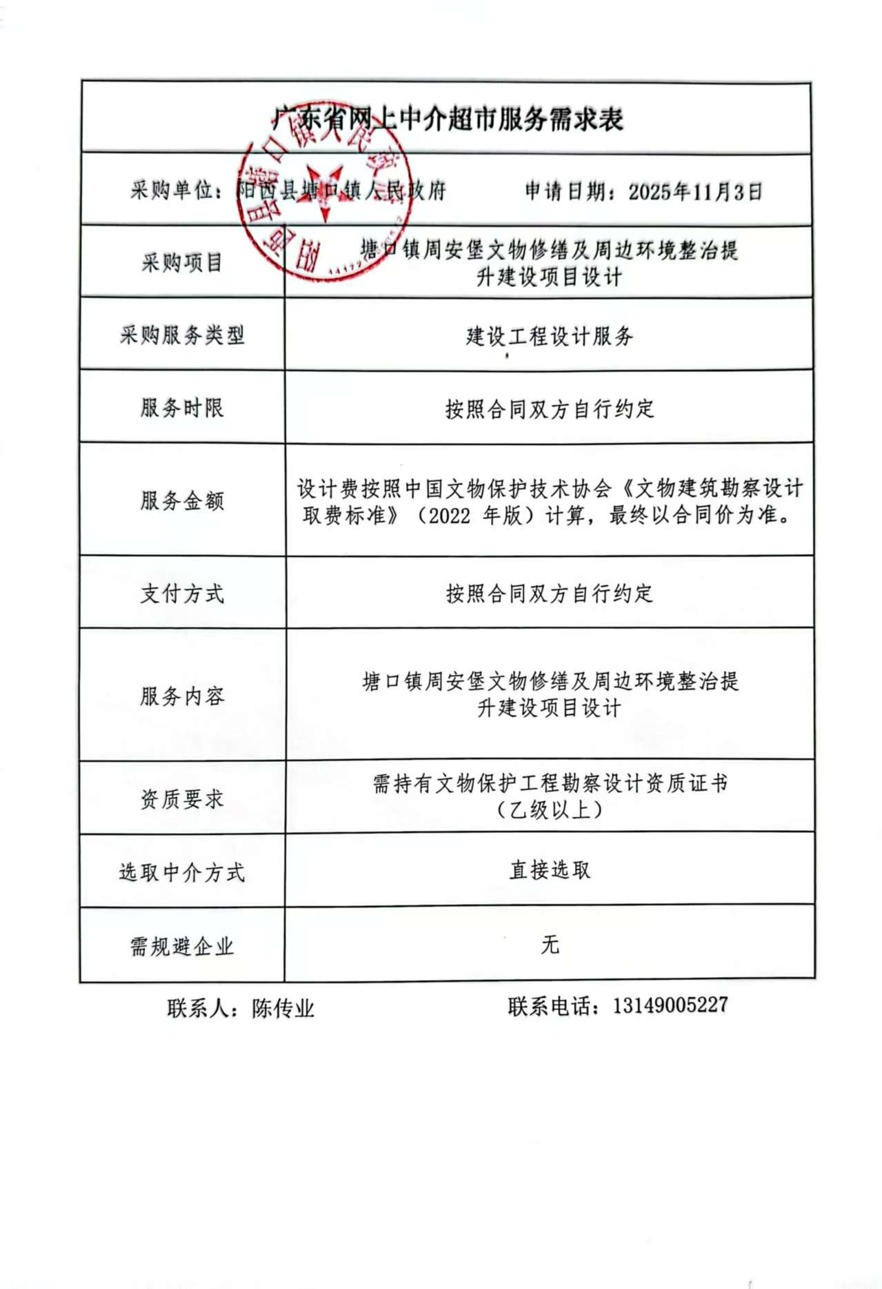 委托服务单位开展塘口镇周安堡文物修缮及周边环境整治提升建设项目设计服务。