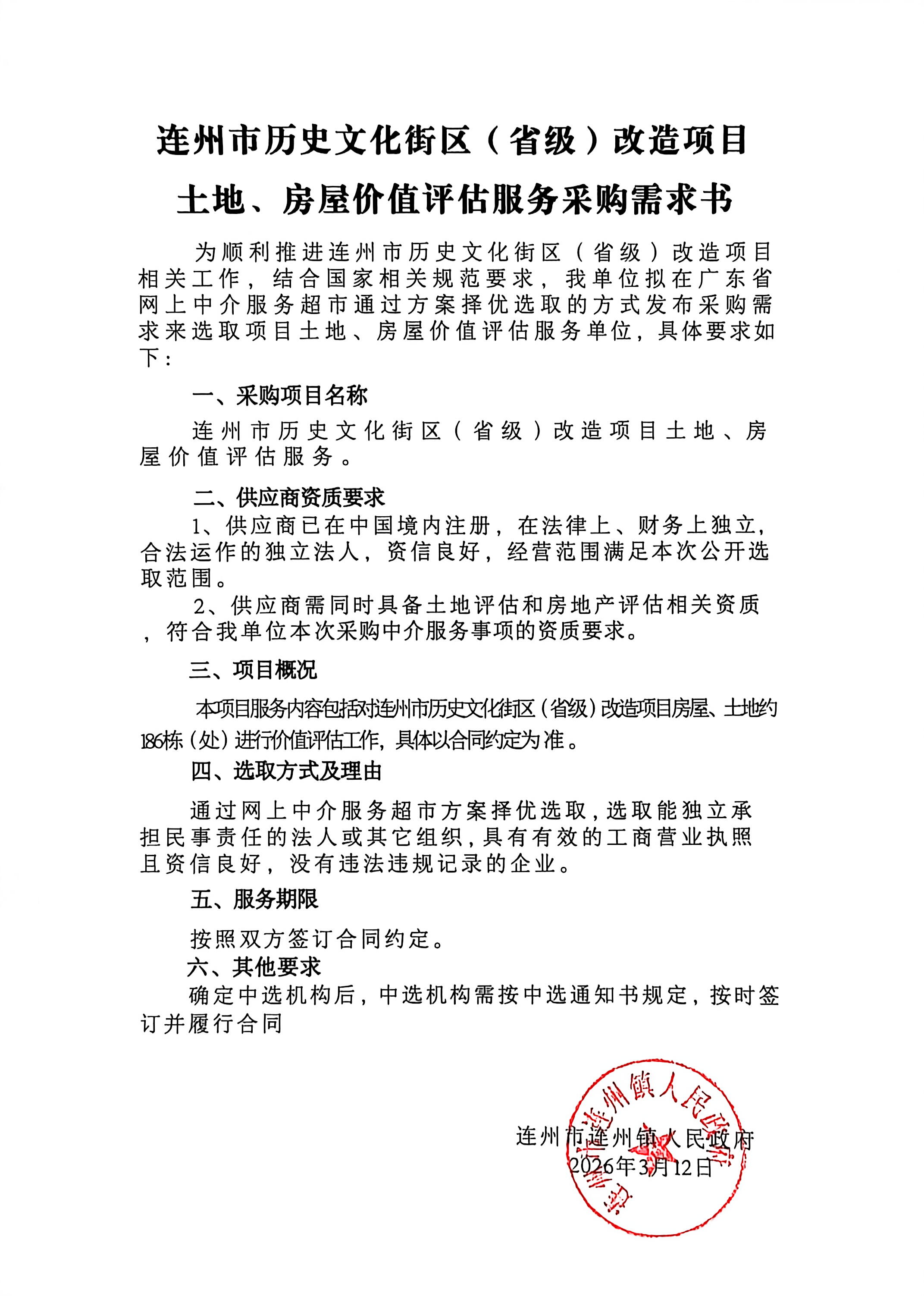 关于为【连州市历史文化街区(省级)改造项目土地、房屋价值评估服务】公开选取【土地评估,房地产估价】机构的公告