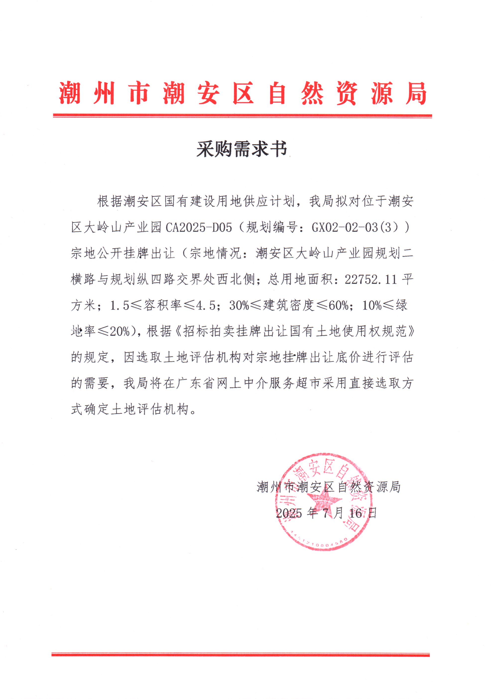 关于为【潮安区大岭山产业园CA2025-D05(规划编号:GX02-02-03(3)土地评估项目】公开选取【土地评估】机构的公告