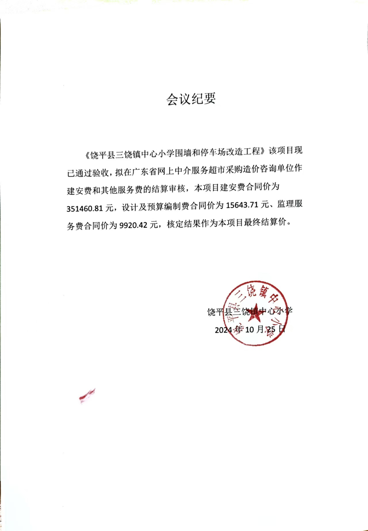 提供建设工作造价咨询服务,对单位工程进行结算审核并出具结算审核报告。工程内容:饶平县三饶镇中心小学围墙和停车场改造等内容,工程开工时间:2024年09月,工程竣工时间:2024年10月;工程实际地点:饶平县;合同价金额:351460.81元。及对设计及预算编制费(送审金额15643.71元)、监理服务费(送审金额9920.42元)进行审核并出具结算审核。