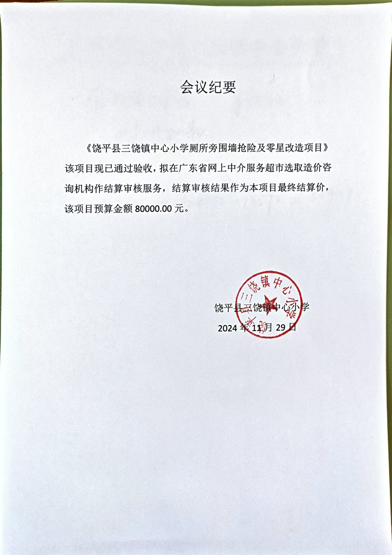 提供建设工作造价咨询服务,对单位工程进行结算审核并出具结算审核报告。建设内容:饶平县三饶镇中心小学厕所旁围墙抢险及零星改造等,工程开工时间:2024年11月,工程竣工时间:2024年11月;建设地点:饶平县三饶镇,预算金额:80000.00元。