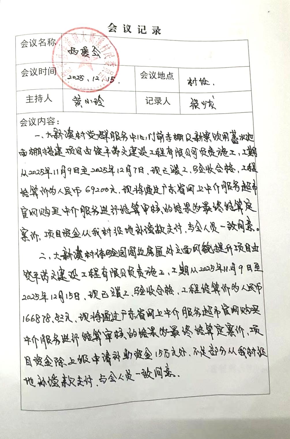 协助开展对大新溪村体验园周边房屋外立面风貌提升项目工程建安费的结算审核,工程项目地址:饶平县浮滨镇大新溪村,工程内容:主要建设内容是对大新溪村文化体验园周边房屋外立面风貌进行提升,对房屋外立面脏乱进行清洗修补及喷漆,外立面面积约3500平方米。工期从2025年11月9日开始施工,至2025年12月15日。现已竣工验收合格,结算金额为166878.82元。项目资金除上级申请补助资金15万元外,不足部分从我村省道S501征地补偿款支出。