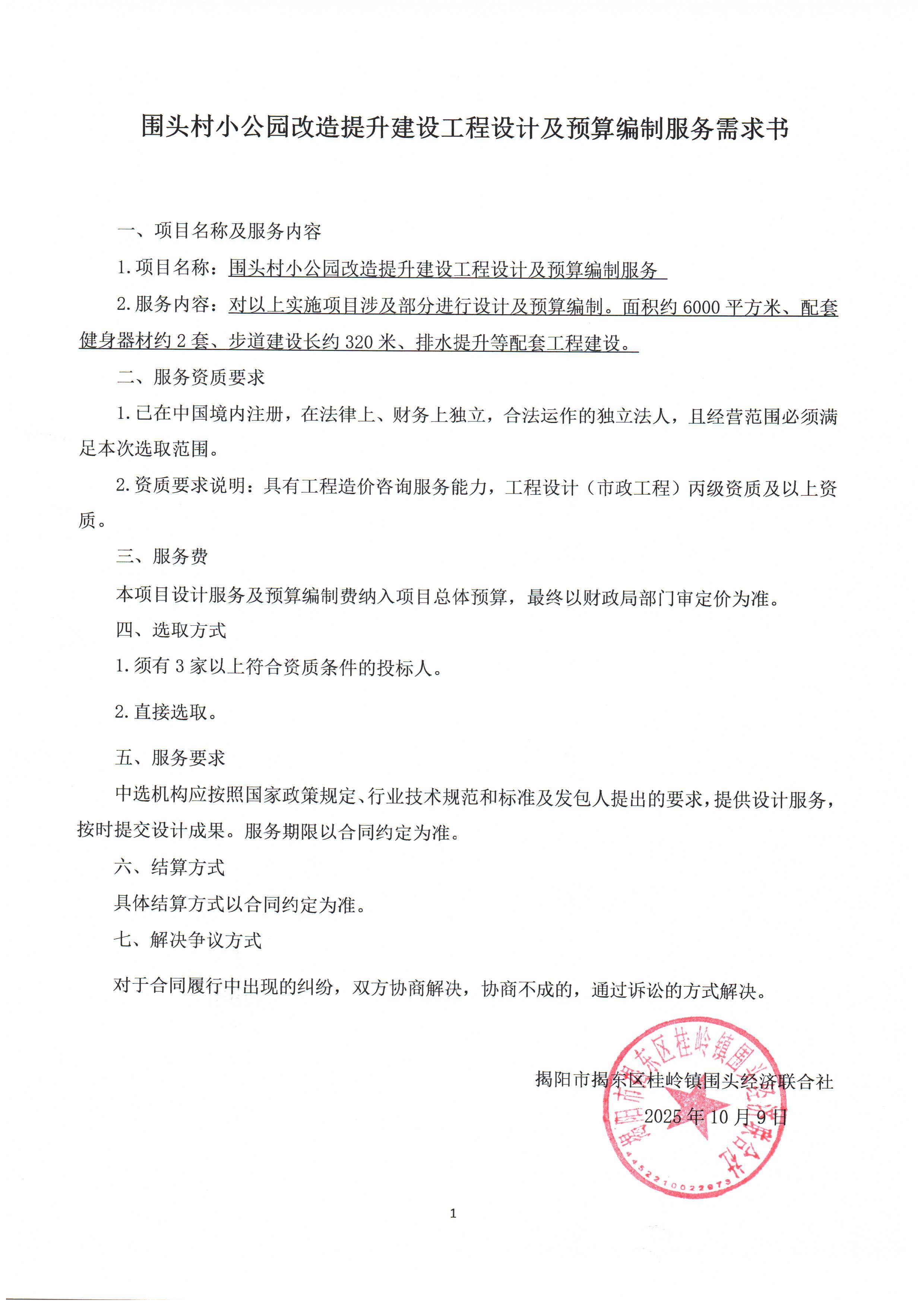 1.项目名称:围头村小公园改造提升建设工程设计及预算编制服务