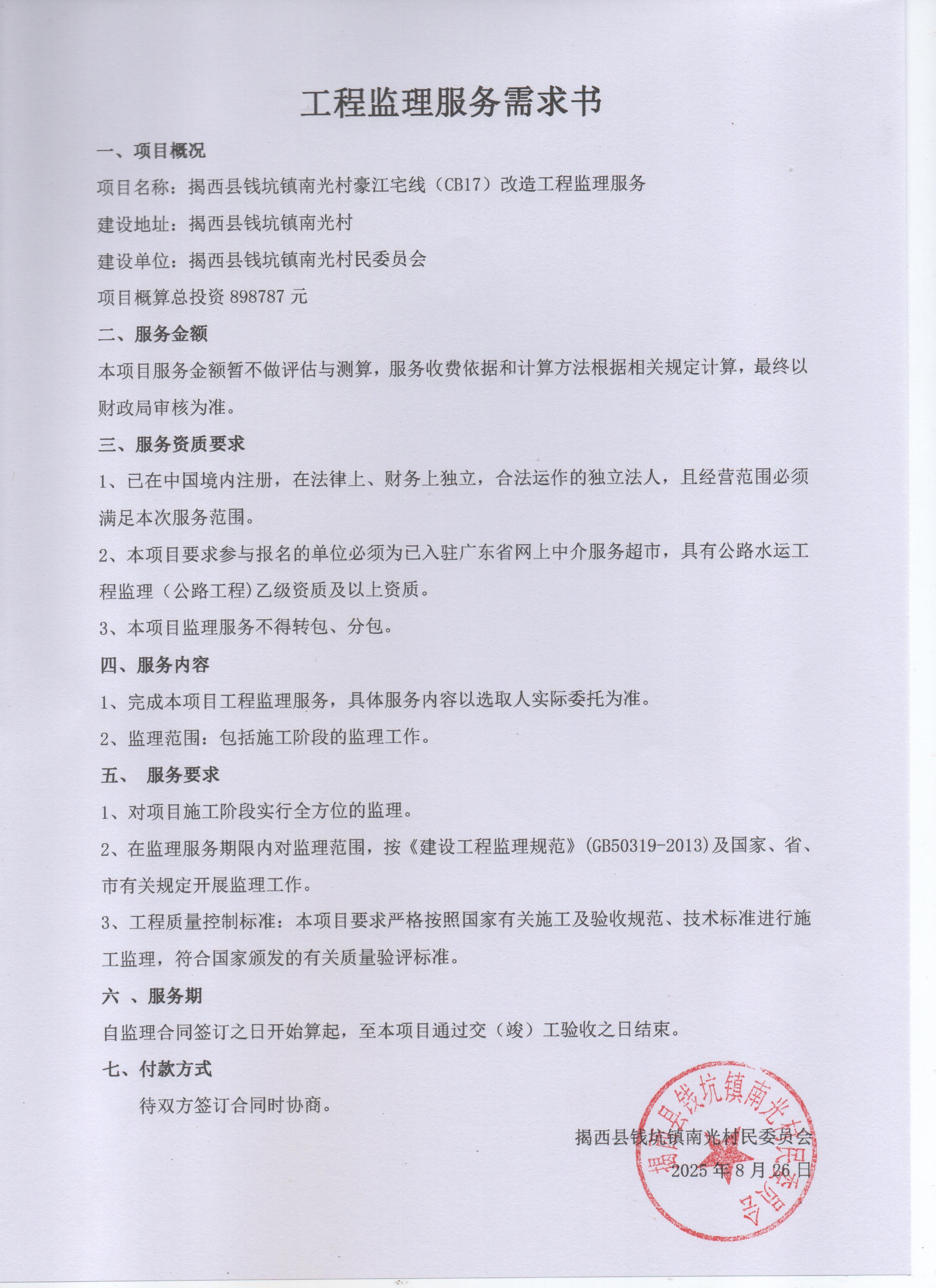 关于为【揭西县钱坑镇南光村豪江宅线(CB17)改造工程监理服务】公开选取【公路水运工程监理】机构的公告