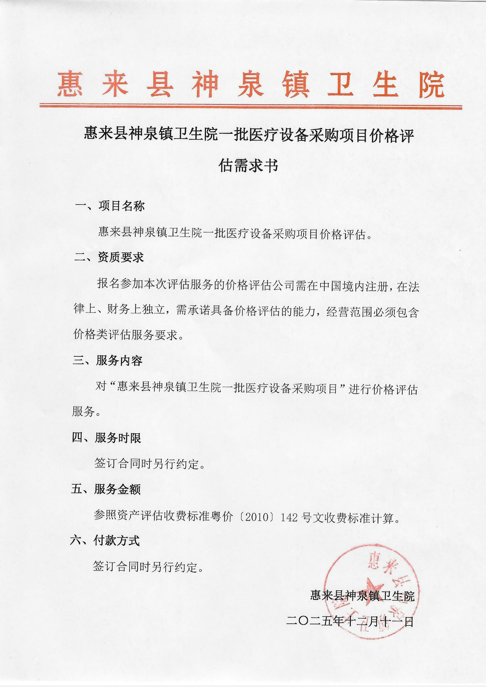 对惠来县神泉镇卫生院一批医疗设备采购项目进行价格评估服务