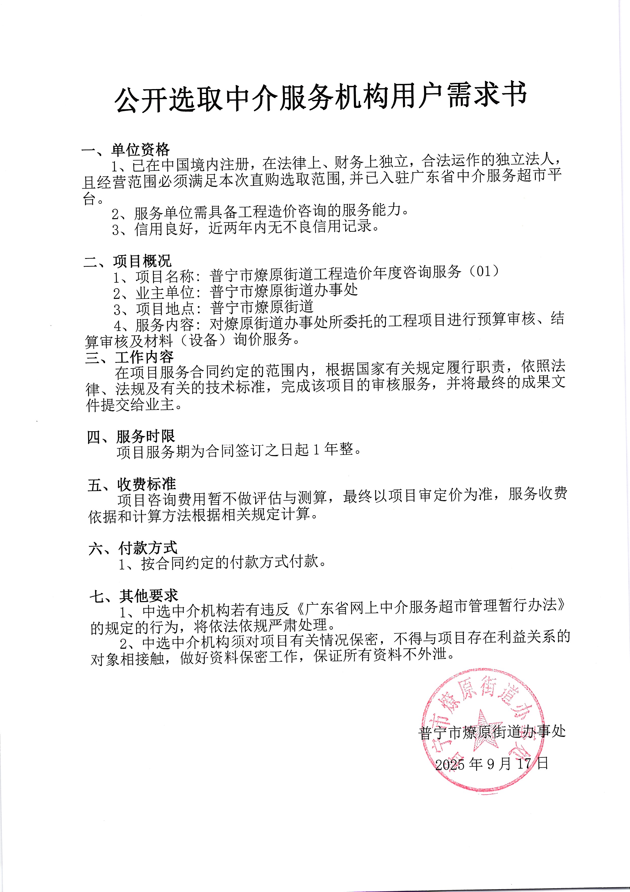关于为【普宁市燎原街道工程造价年度咨询服务(01)】公开选取【工程造价咨询】机构的公告