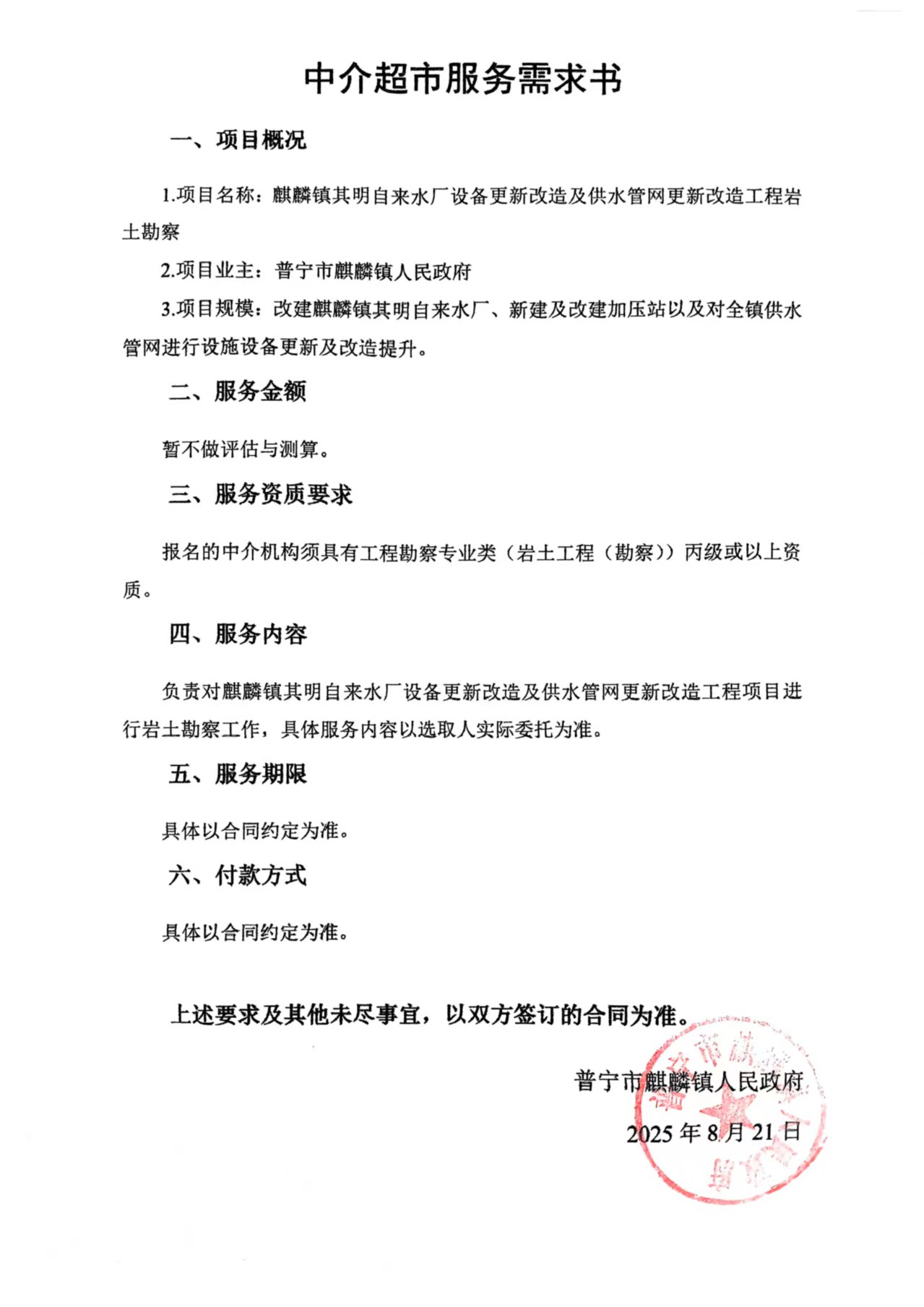 2025-08-29 17:30 ,在广东省网上中介服务超市为普宁市麒麟镇人民政府 公开选取工程勘察中介服务机构,现将相关事项公告如下: