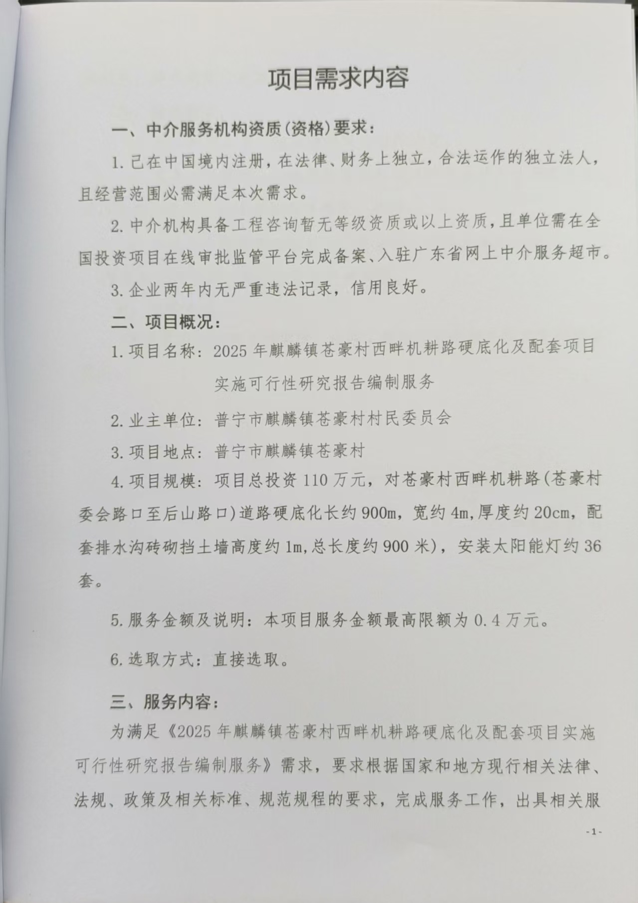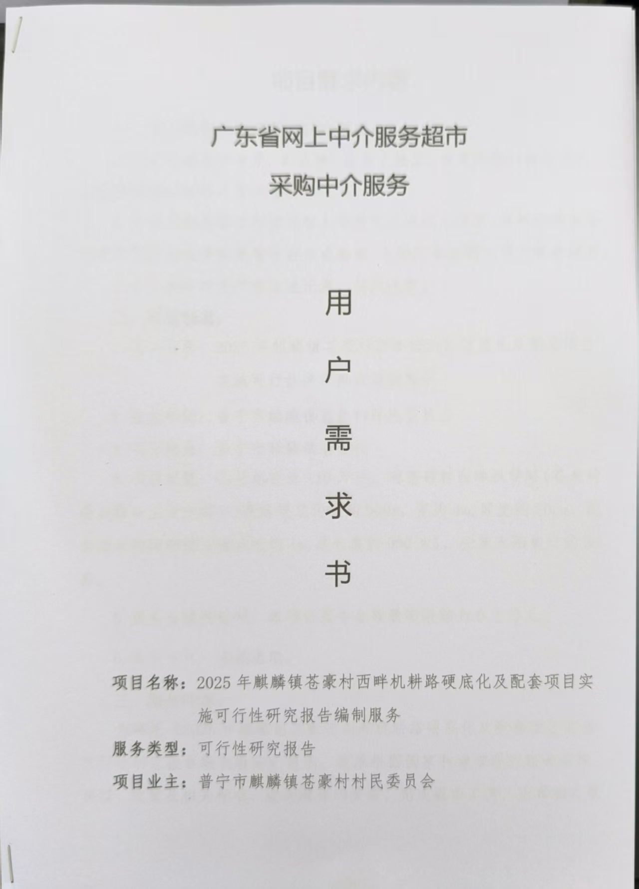 为满足《2025 年麒麟镇苍豪村西畔机耕路硬底化及配套项目实施可行性研究报告编制服务》需求,要求根据国家和地方现行相关法律、法规、政策及相关标准、规范规程的要求,完成服务工作,出具相关服务成果,并主动做好后期的跟进工作。